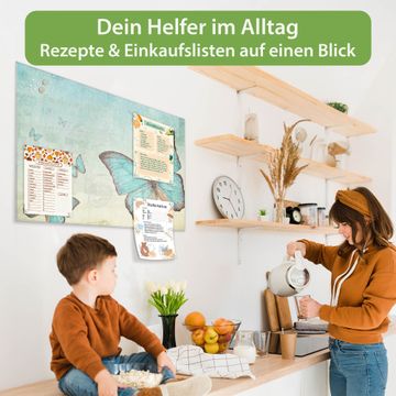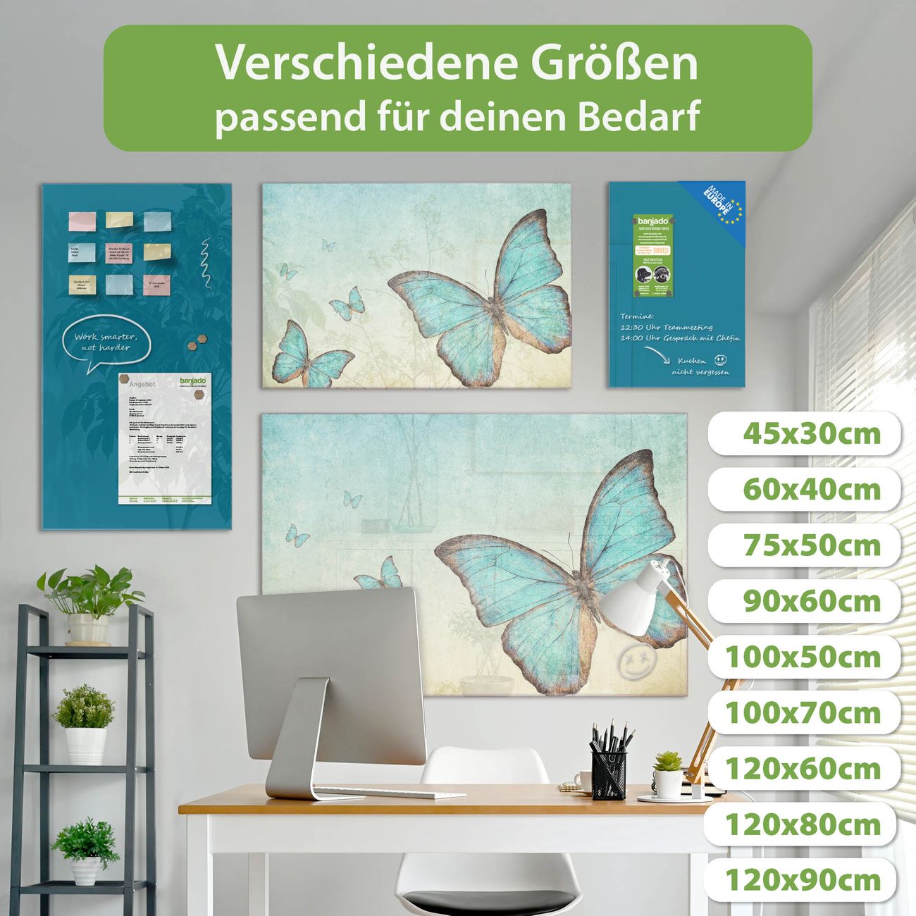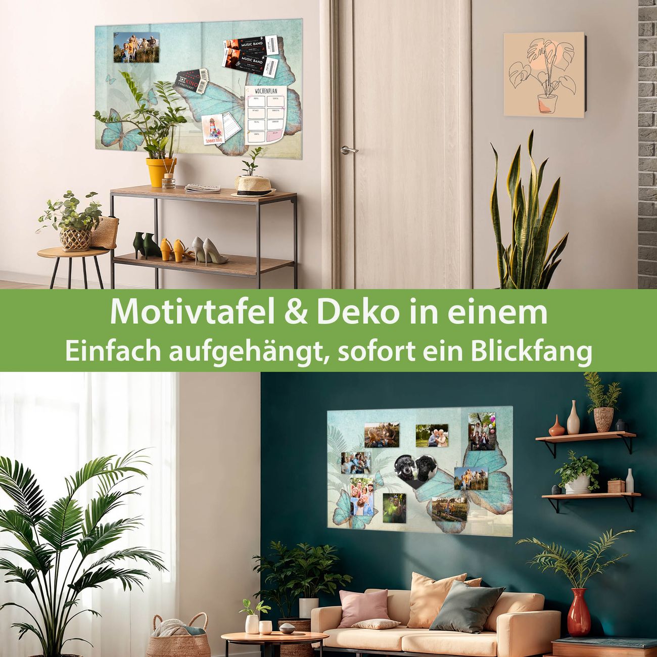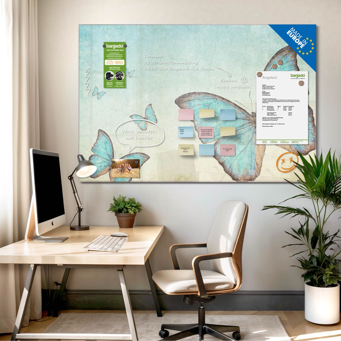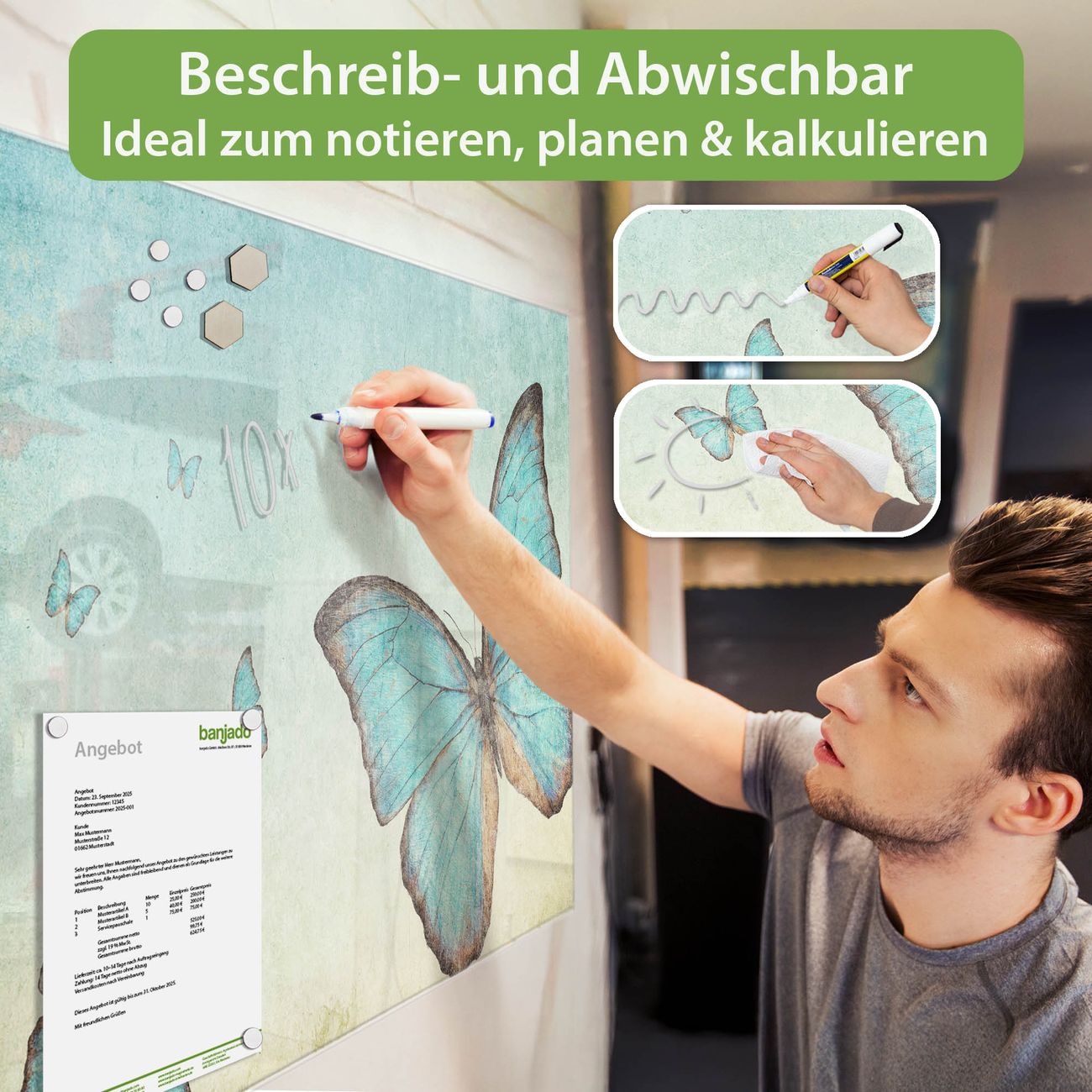 Die banjado Glas Magnettafel mit dem Motiv Motiv Blaue Schmetterlinge verbindet Funktionalität mit Stil. Sie ersetzt das Zettelchaos durch klare Strukturen und bringt dabei eine warme, natürliche Atmosphäre in Ihr Zuhause. Ob im Büro, in der Küche oder im Eingangsbereich - dieses Design-Board zieht Blicke an und sorgt für Ordnung mit Charakter.