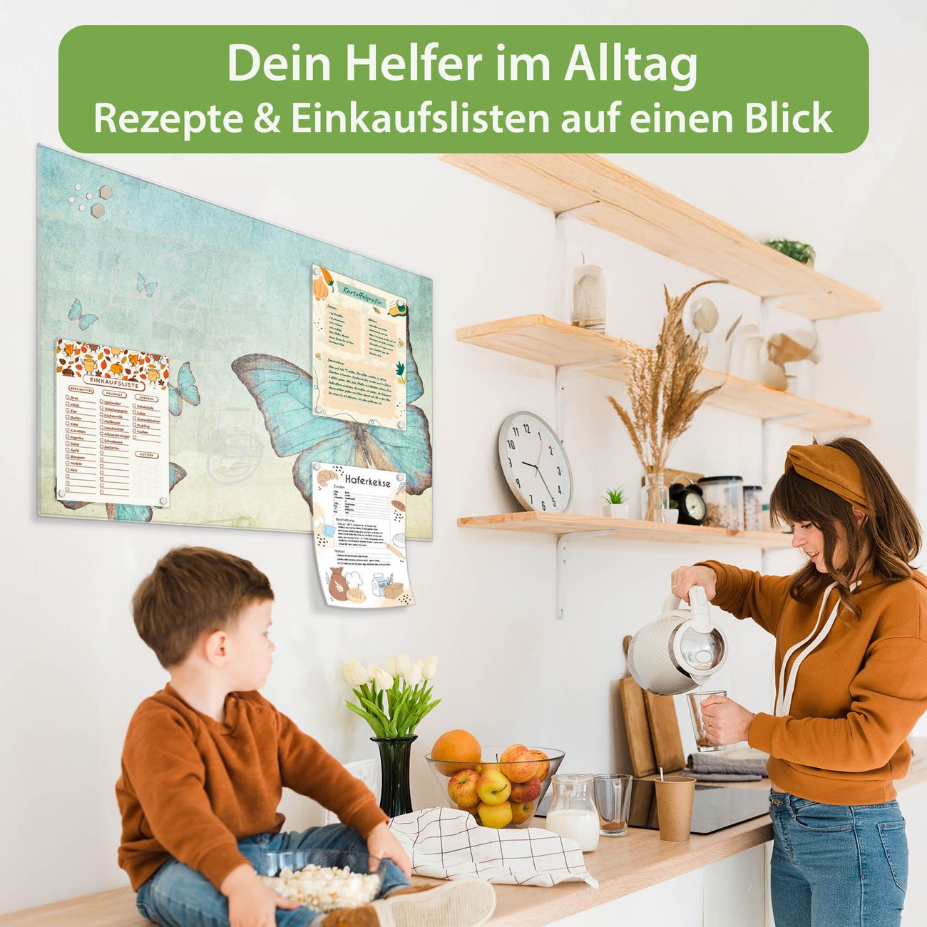 Ein Stück Design, das Ihren Alltag organisiert. Schreiben, heften, inspirieren - alles an einem Ort. Qualität, die man spürt. Montage leicht gemacht. Handwerk mit Herz - veredelt in Sachsen. Einzigartiges Design mit Motiv Motiv Blaue Schmetterlinge Beschreibbare Glasoberfläche, leicht zu reinigen Starke Magnetkraft durch Stahlrückwand Inklusive 4 Neodym-Magneten Flexible Montageoptionen Handveredelt in Sachsen - Qualität, die bleibt
