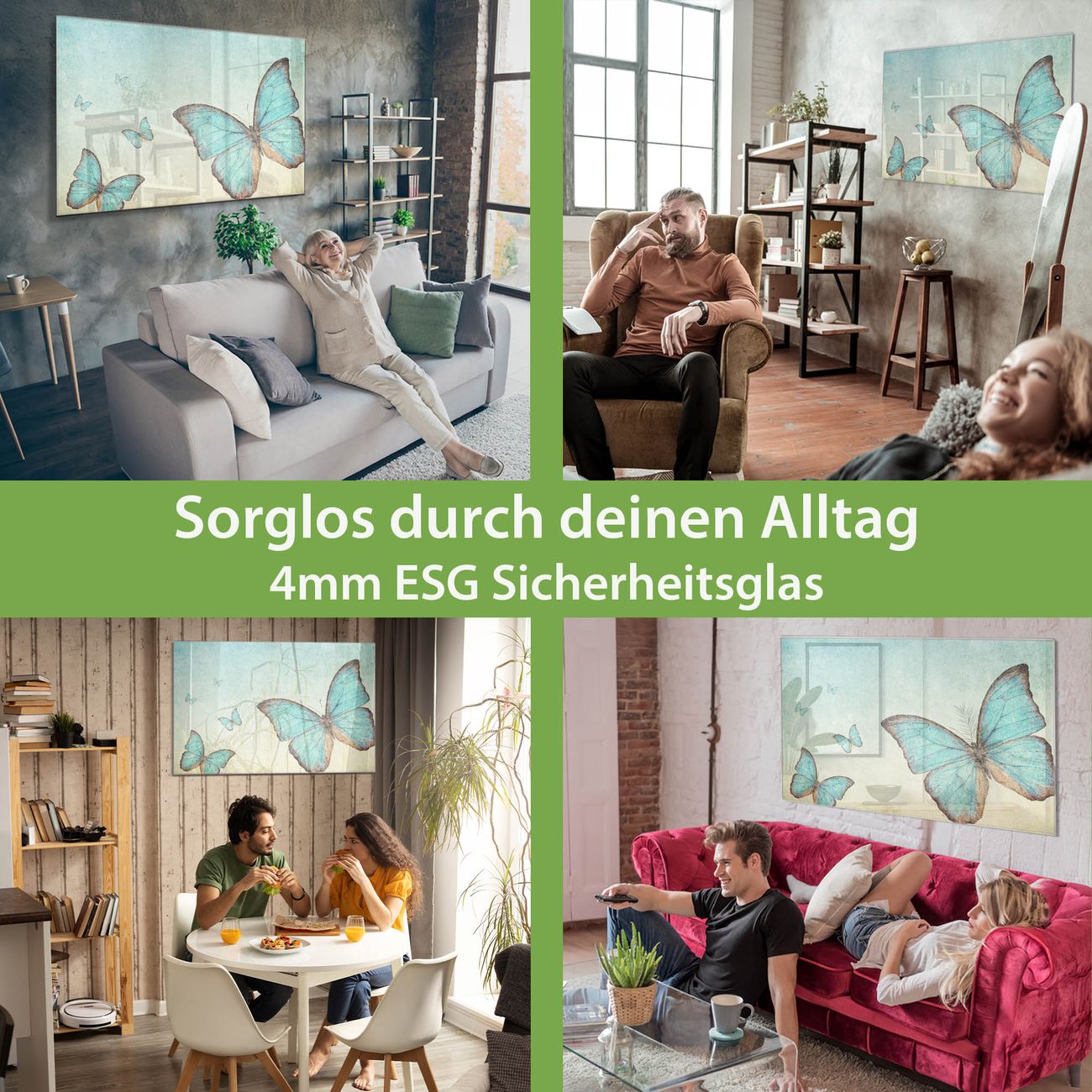 Material: 4mm Sicherheitsglas mit Metallrückwand Eigenschaften: beschreibbar, magnetisch, kratzfest Maße: 75x50x0,6cm, 5,63kg schwer Motiv Nummer 10657 Blaue Schmetterlinge Zubehör: inklusive 4 Neodym-Magnete