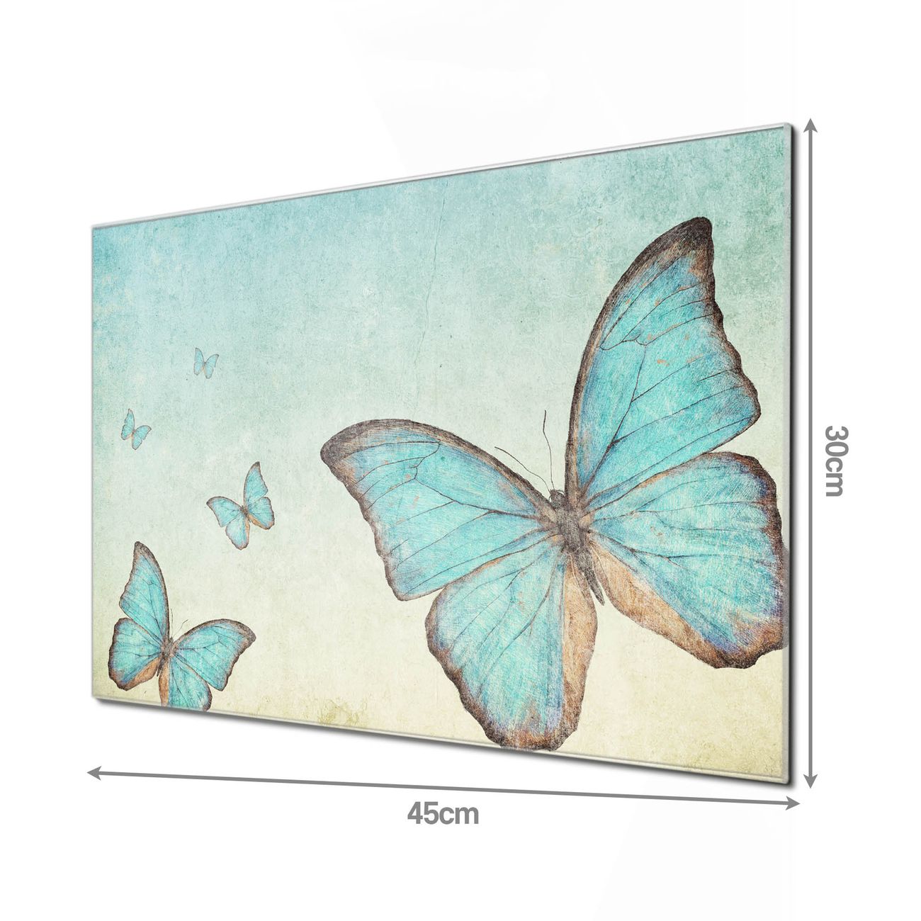 Material: 4mm Sicherheitsglas mit Metallrückwand Eigenschaften: beschreibbar, magnetisch, kratzfest Maße: 45x30x0,6cm, 2,03kg schwer Motiv Nummer 10657 Blaue Schmetterlinge Zubehör: inklusive 4 Neodym-Magnete