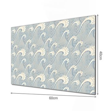 Material: 4mm Sicherheitsglas mit Metallrückwand Eigenschaften: beschreibbar, magnetisch, kratzfest Maße: 60x40x0,6cm, 3,6kg schwer Motiv Nummer 11511 Blaue Wellen Zubehör: inklusive 4 Neodym-Magnete