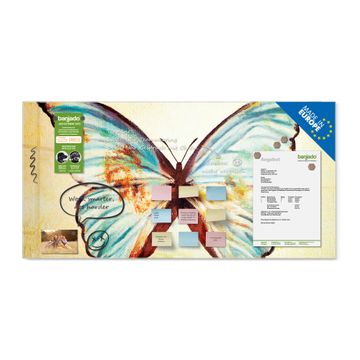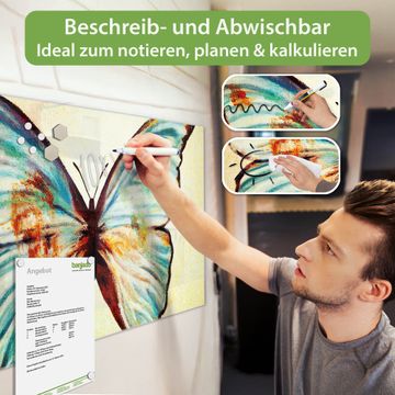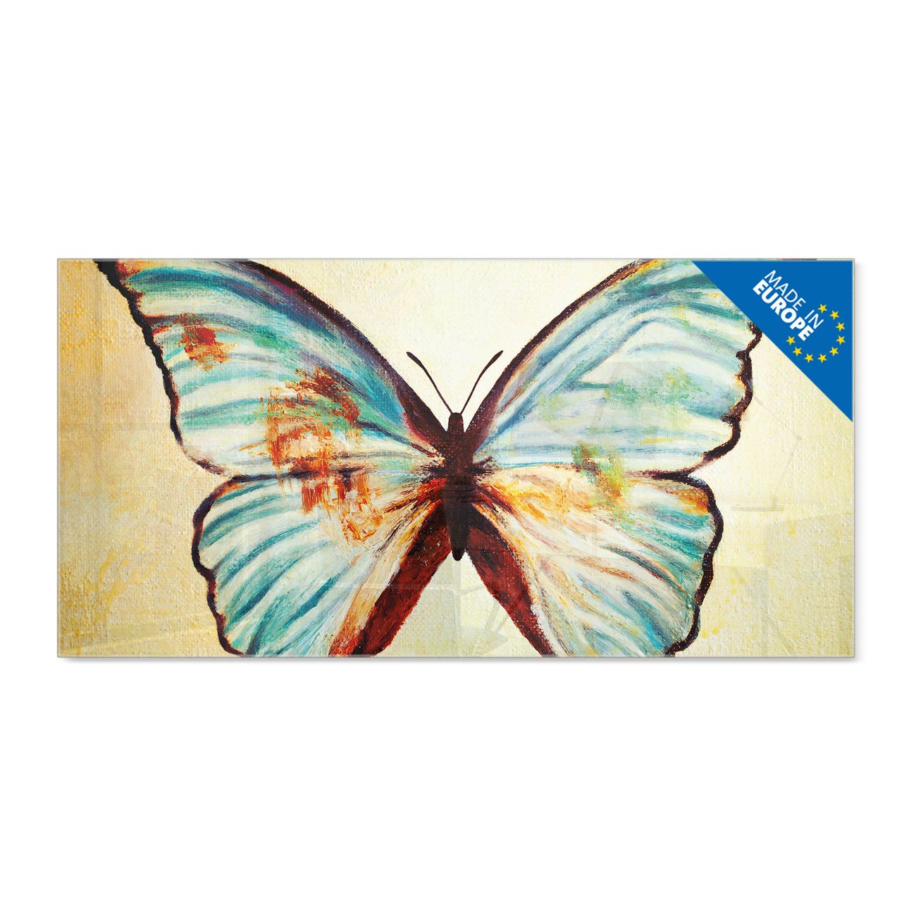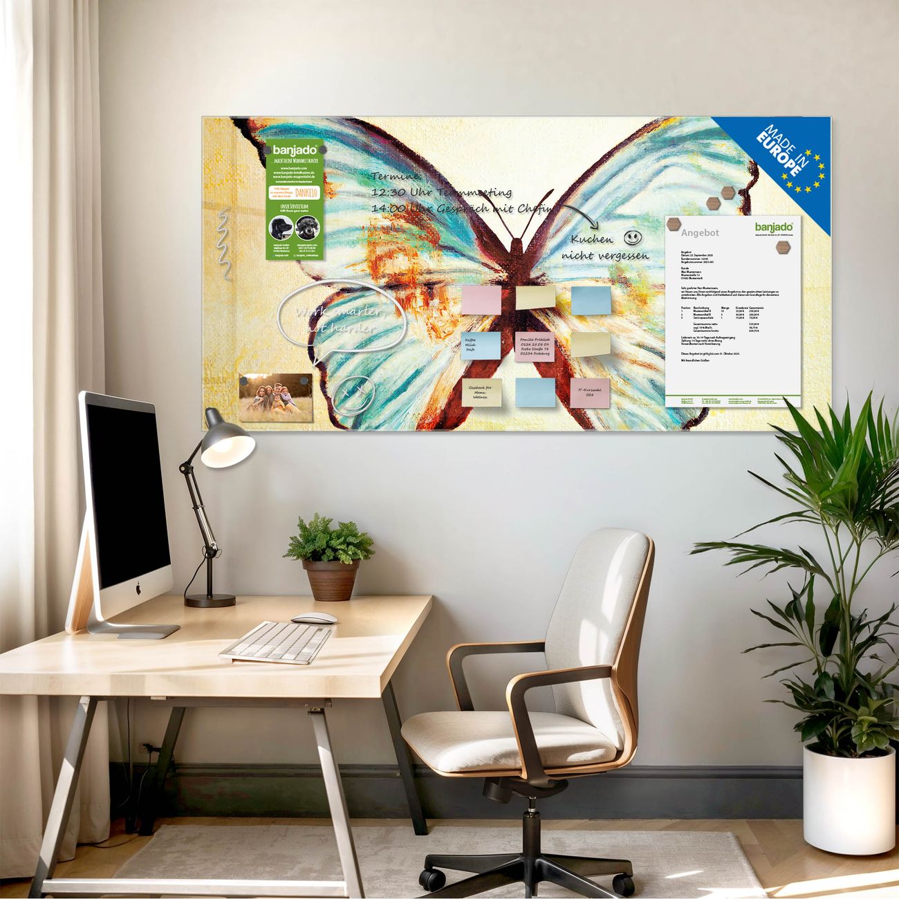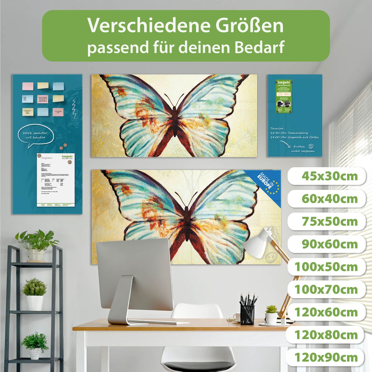 Material: 4mm Sicherheitsglas mit Metallrückwand Eigenschaften: beschreibbar, magnetisch, kratzfest Maße: 100x50x0,6cm, 7,50kg schwer Motiv Nummer 12311 Blauer Falter Zubehör: inklusive 4 Neodym-Magnete