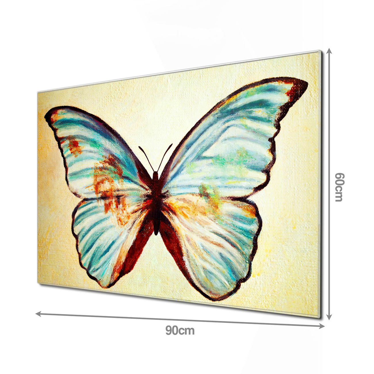 Material: 4mm Sicherheitsglas mit Metallrückwand Eigenschaften: beschreibbar, magnetisch, kratzfest Maße: 90x60x0,6cm, 8,10kg schwer Motiv Nummer 12311 Blauer Falter Zubehör: inklusive 4 Neodym-Magnete