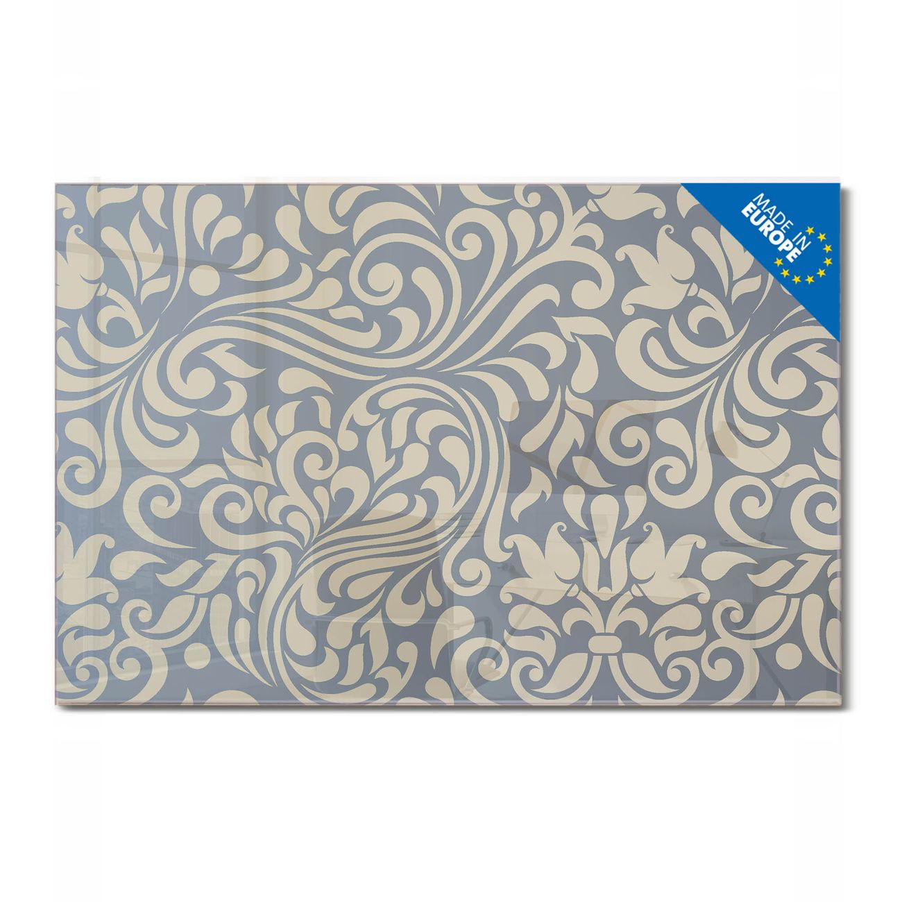 Material: 4mm Sicherheitsglas mit Metallrückwand Eigenschaften: beschreibbar, magnetisch, kratzfest Maße: 45x30x0,6cm, 2,03kg schwer Motiv Nummer 10917 Blaues Ornament Zubehör: inklusive 4 Neodym-Magnete