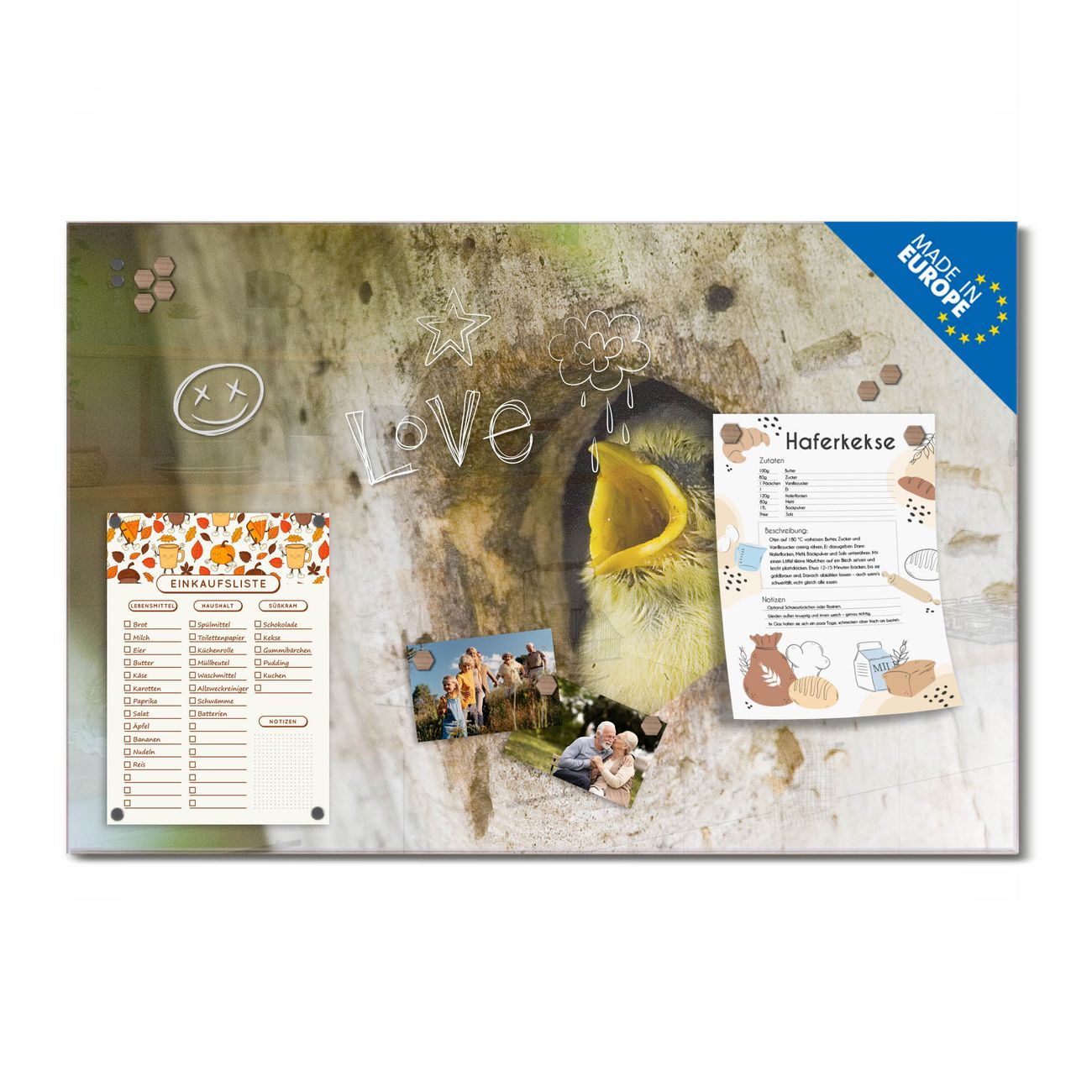 Material: 4mm Sicherheitsglas mit Metallrückwand Eigenschaften: beschreibbar, magnetisch, kratzfest Maße: 75x50x0,6cm, 5,63kg schwer Motiv Nummer 10520 Blaumeise Zubehör: inklusive 4 Neodym-Magnete