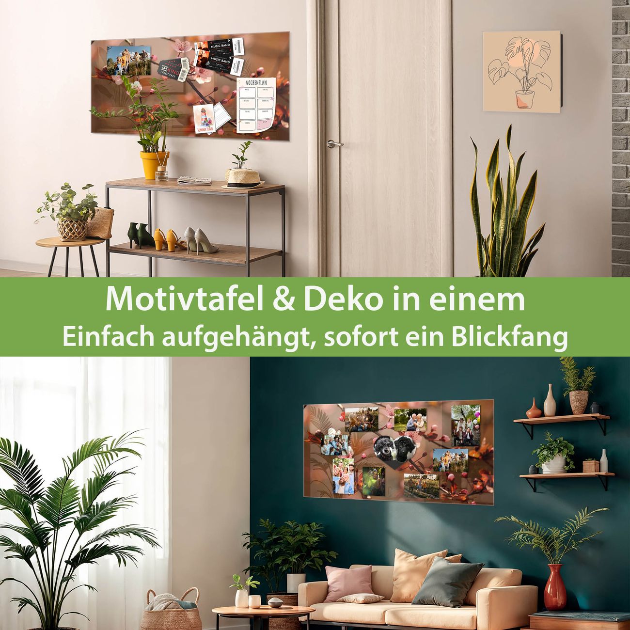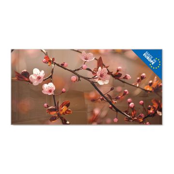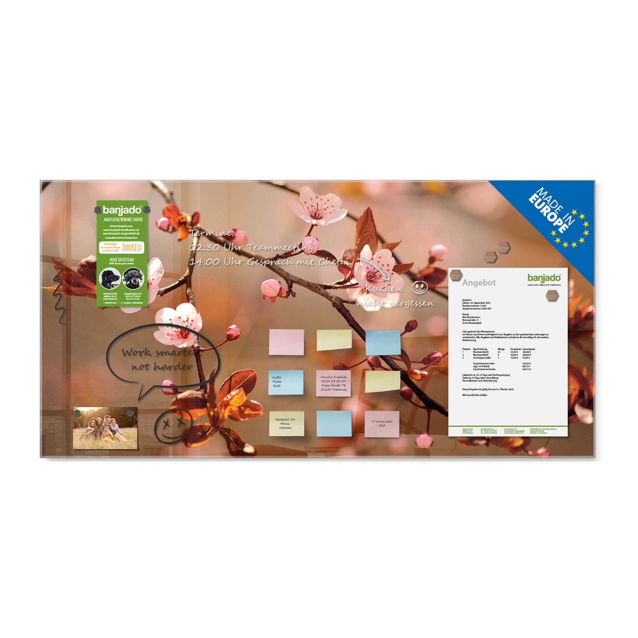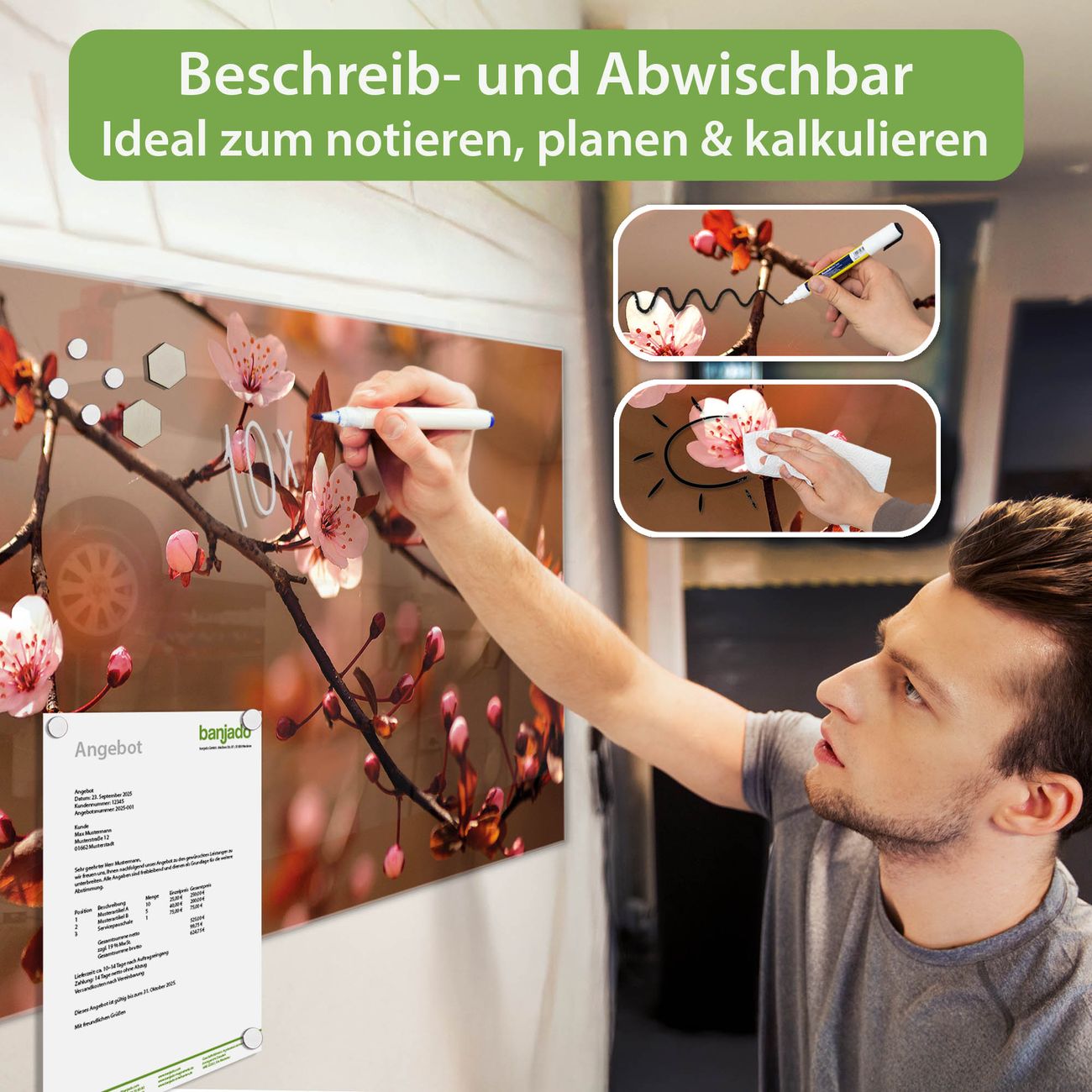 Material: 4mm Sicherheitsglas mit Metallrückwand Eigenschaften: beschreibbar, magnetisch, kratzfest Maße: 100x50x0,6cm, 7,50kg schwer Motiv Nummer 12287 Blühender Kirschzweig Zubehör: inklusive 4 Neodym-Magnete