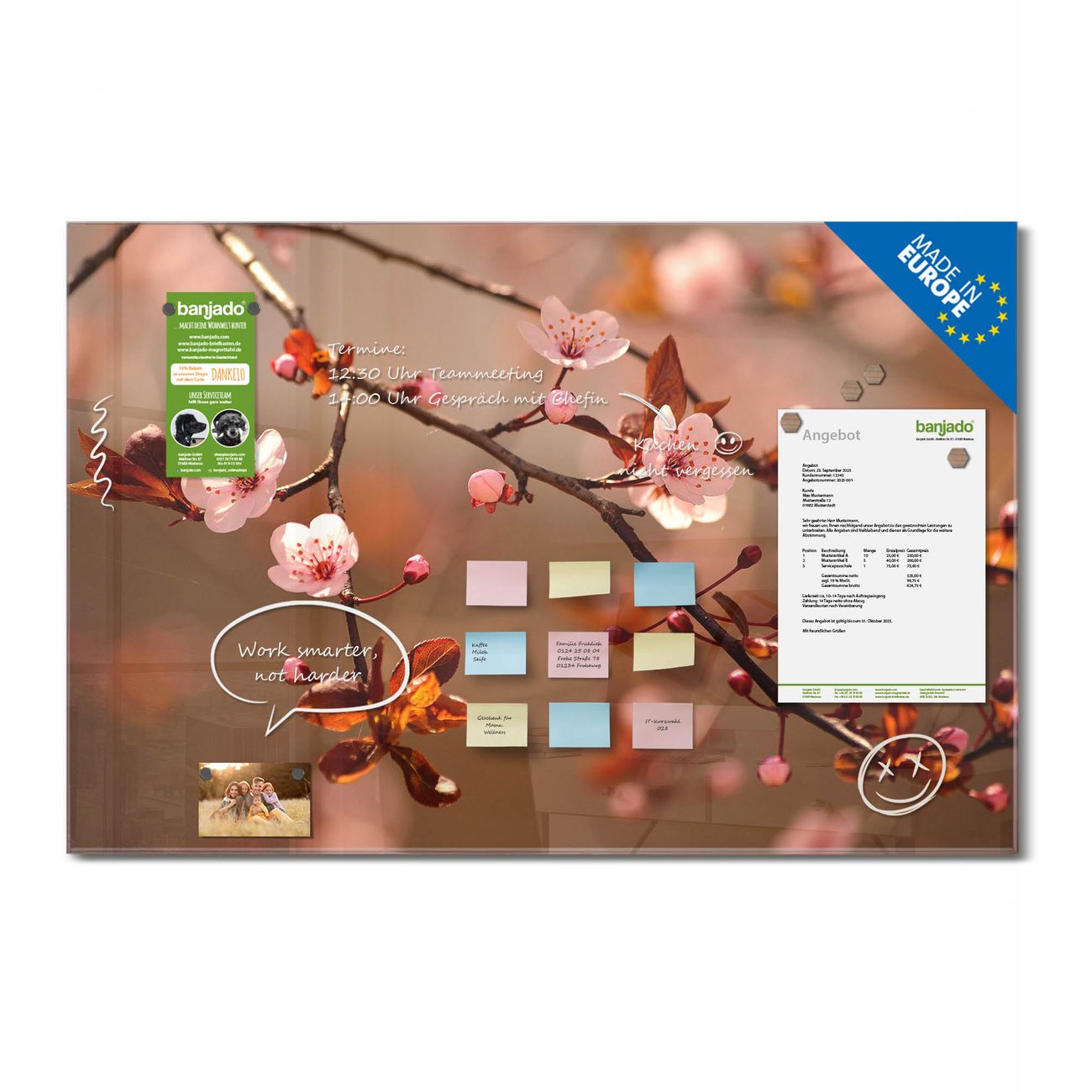 Material: 4mm Sicherheitsglas mit Metallrückwand Eigenschaften: beschreibbar, magnetisch, kratzfest Maße: 120x80x0,6cm, 14,40kg schwer Motiv Nummer 12287 Blühender Kirschzweig Zubehör: inklusive 4 Neodym-Magnete
