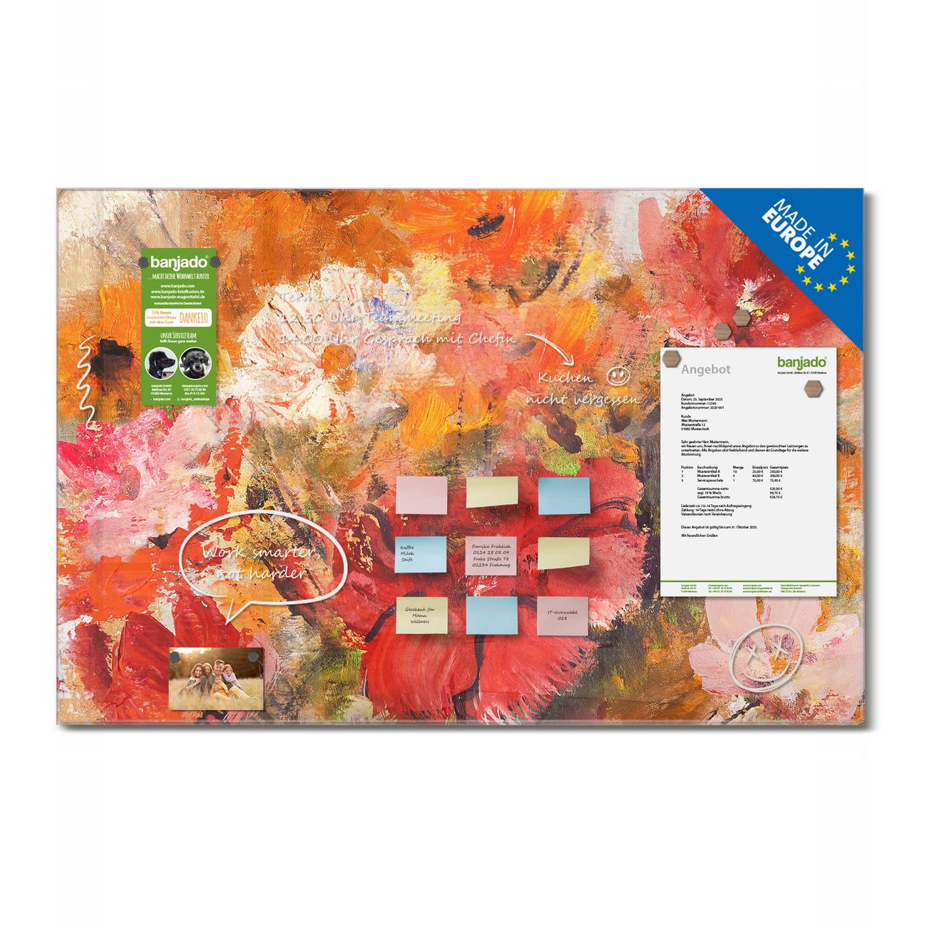 Material: 4mm Sicherheitsglas mit Metallrückwand Eigenschaften: beschreibbar, magnetisch, kratzfest Maße: 120x80x0,6cm, 14,40kg schwer Motiv Nummer 12351 Fallende Blumen Zubehör: inklusive 4 Neodym-Magnete