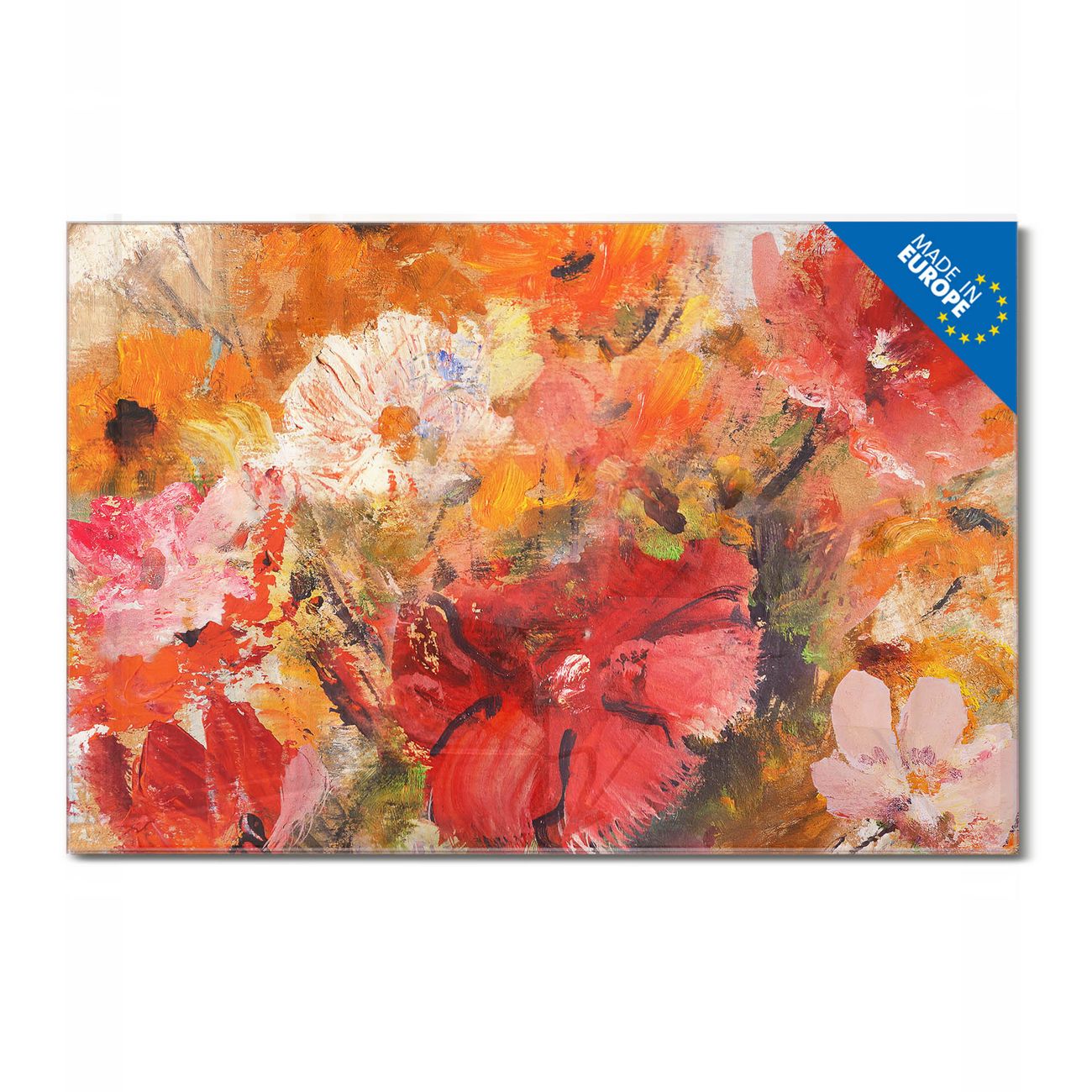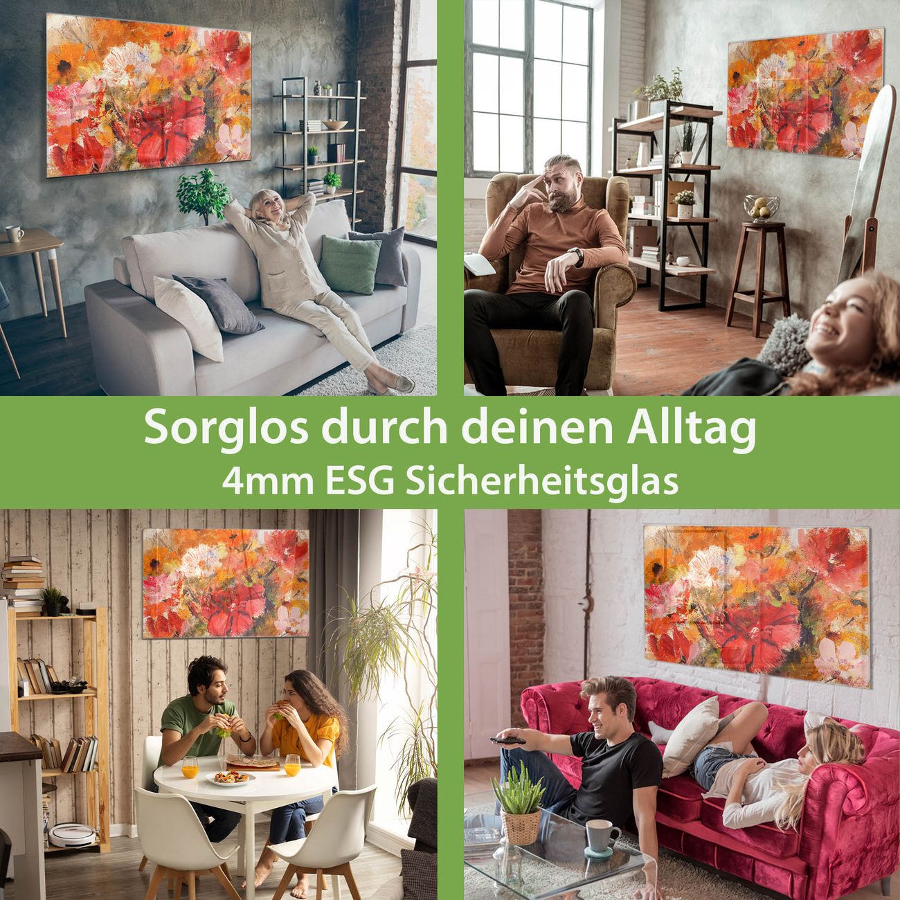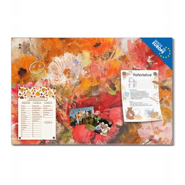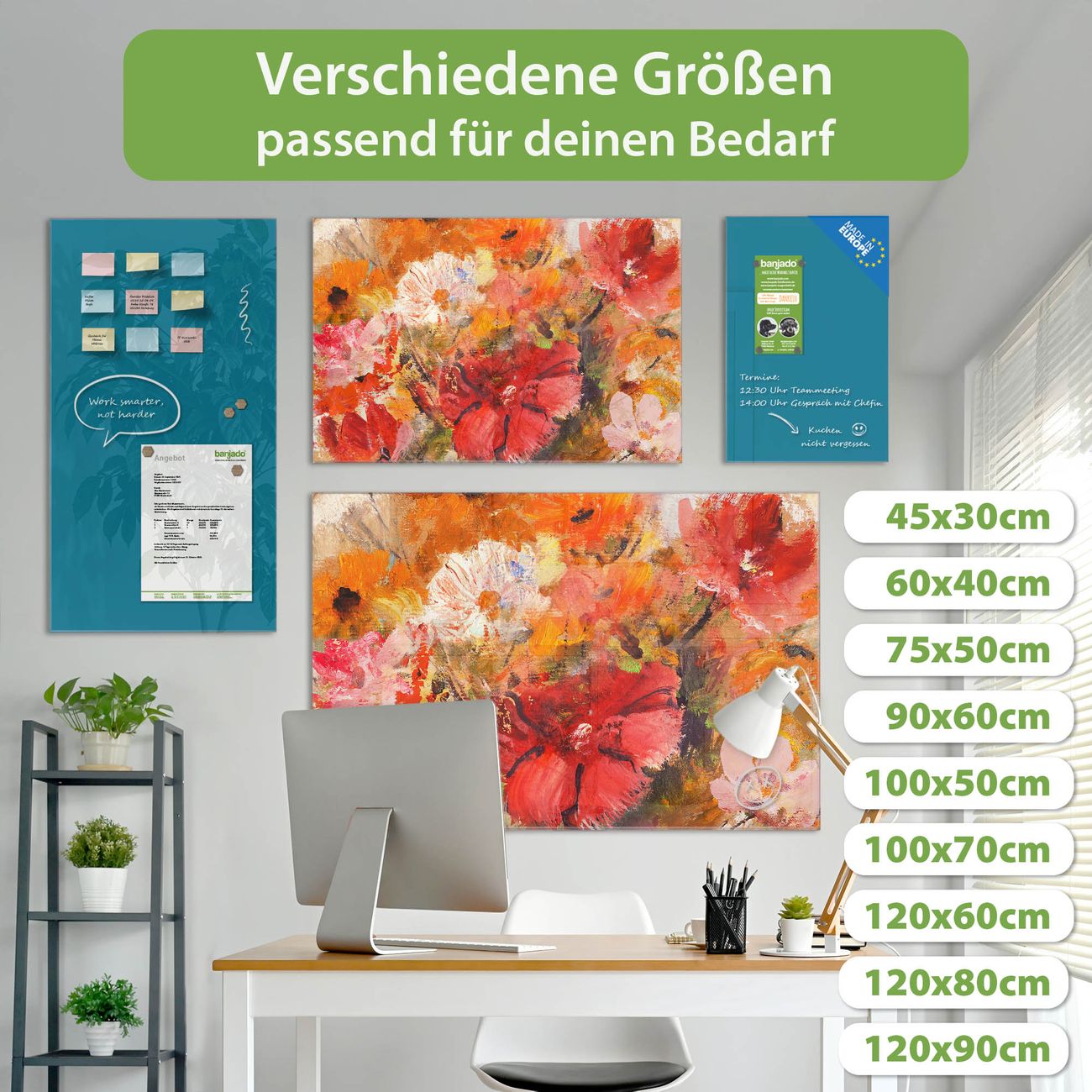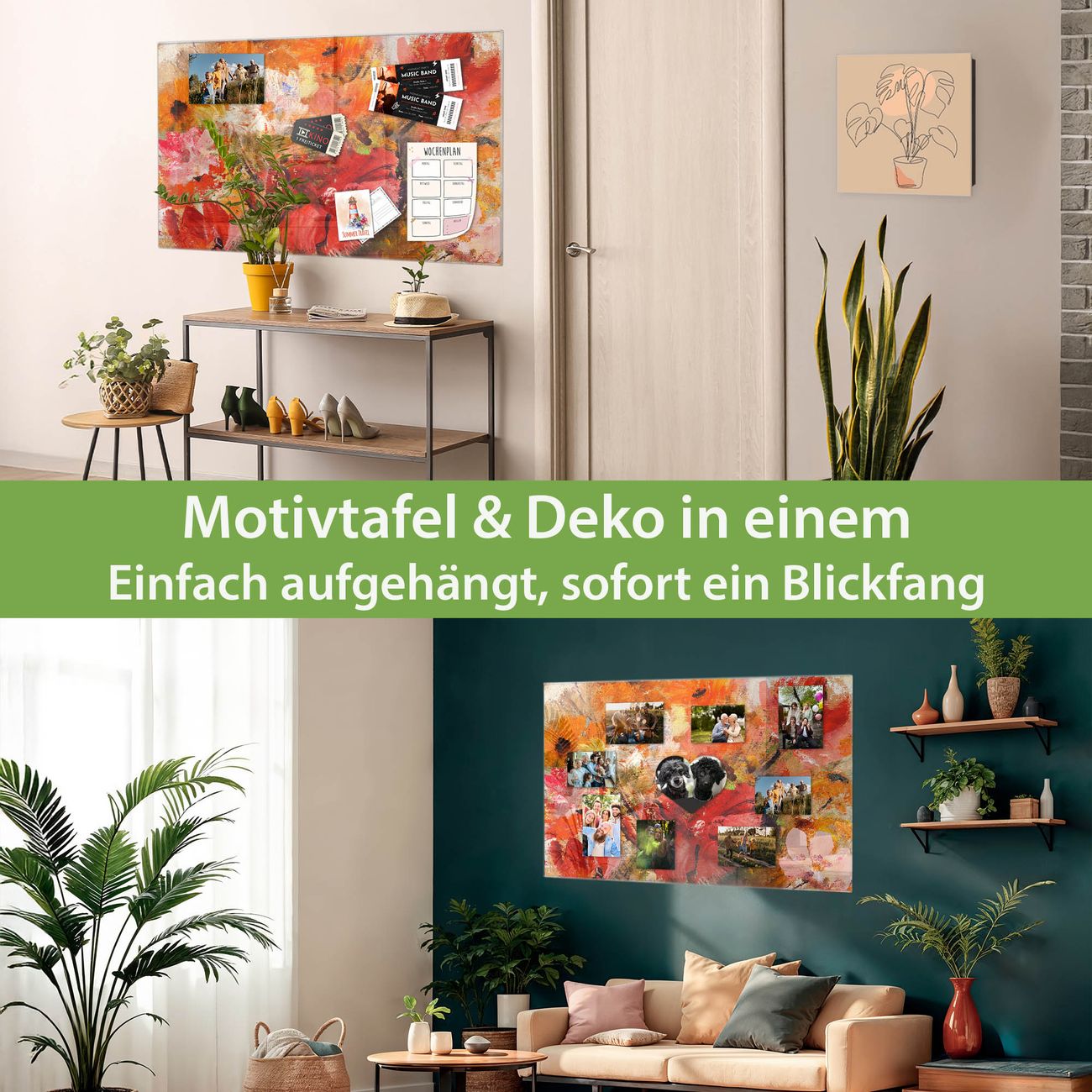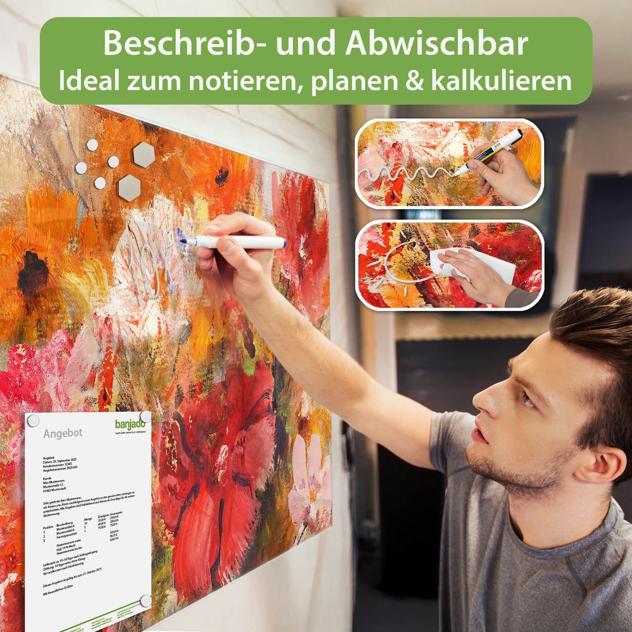 Material: 4mm Sicherheitsglas mit Metallrückwand Eigenschaften: beschreibbar, magnetisch, kratzfest Maße: 75x50x0,6cm, 5,63kg schwer Motiv Nummer 12351 Fallende Blumen Zubehör: inklusive 4 Neodym-Magnete