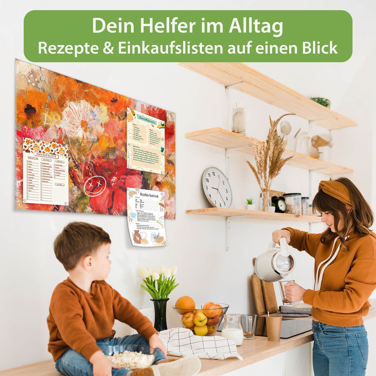 Auf der glatten Glasoberfläche lassen sich Termine, Rezepte oder Notizen ganz einfach mit Kreidestiften festhalten und rückstandslos entfernen. Starke Neodym-Magnete halten Ihre wichtigsten Erinnerungen sicher an Ort und Stelle. So entsteht Ihre ganz persönliche Ideenwand - jeden Tag neu.