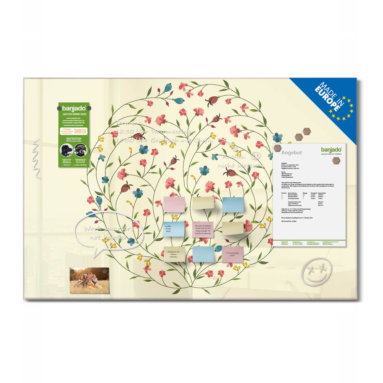 Ein Stück Design, das Ihren Alltag organisiert. Schreiben, heften, inspirieren - alles an einem Ort. Qualität, die man spürt. Montage leicht gemacht. Handwerk mit Herz - veredelt in Sachsen. Einzigartiges Design mit Motiv Motiv Blumenreigen Beschreibbare Glasoberfläche, leicht zu reinigen Starke Magnetkraft durch Stahlrückwand Inklusive 4 Neodym-Magneten Flexible Montageoptionen Handveredelt in Sachsen - Qualität, die bleibt
