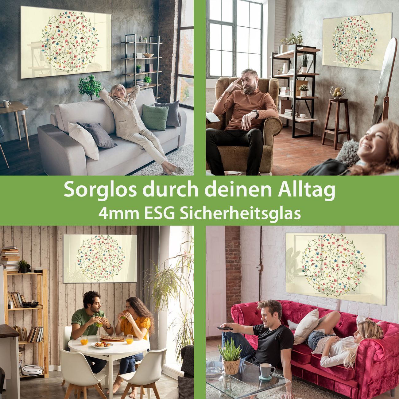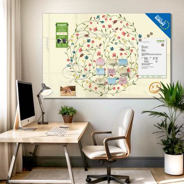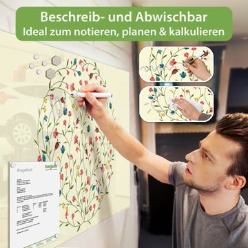 Material: 4mm Sicherheitsglas mit Metallrückwand Eigenschaften: beschreibbar, magnetisch, kratzfest Maße: 75x50x0,6cm, 5,63kg schwer Motiv Nummer 10755 Blumenreigen Zubehör: inklusive 4 Neodym-Magnete