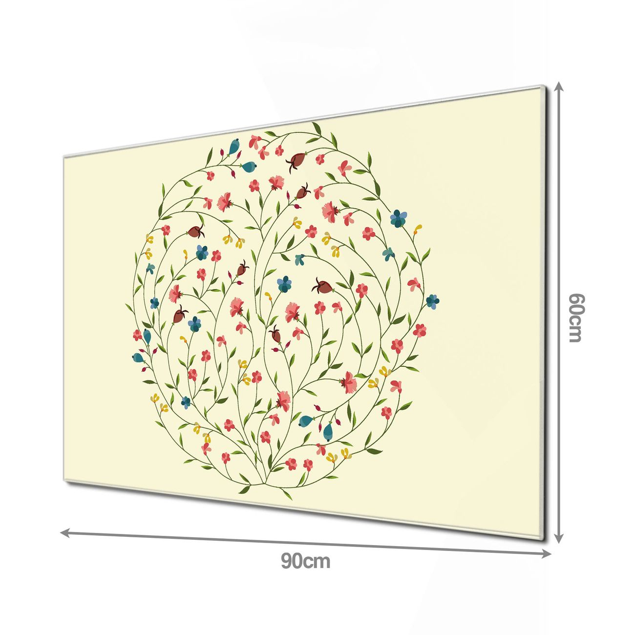 Material: 4mm Sicherheitsglas mit Metallrückwand Eigenschaften: beschreibbar, magnetisch, kratzfest Maße: 90x60x0,6cm, 8,10kg schwer Motiv Nummer 10755 Blumenreigen Zubehör: inklusive 4 Neodym-Magnete