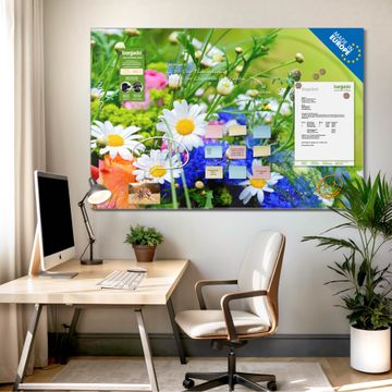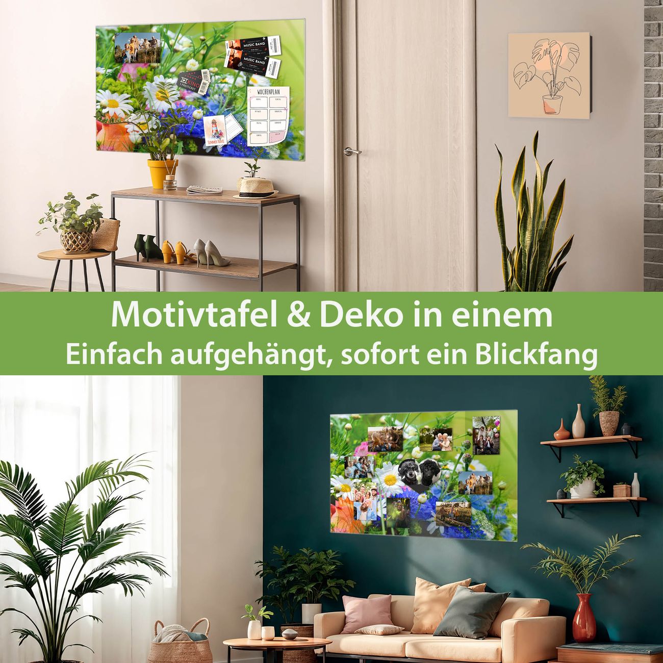 Material: 4mm Sicherheitsglas mit Metallrückwand Eigenschaften: beschreibbar, magnetisch, kratzfest Maße: 120x80x0,6cm, 14,40kg schwer Motiv Nummer 10444 Blumenstrauß Zubehör: inklusive 4 Neodym-Magnete