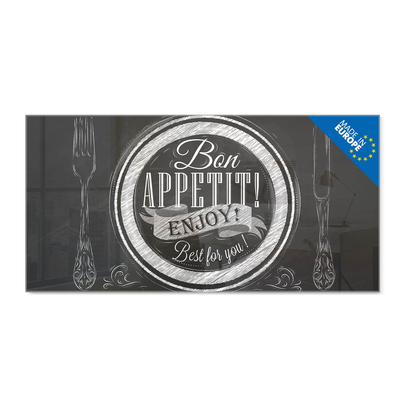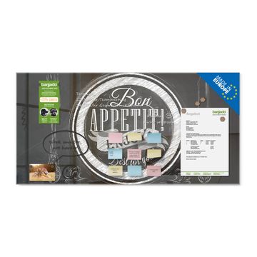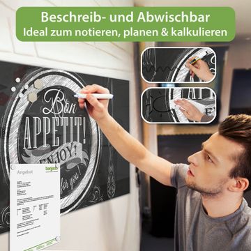 Material: 4mm Sicherheitsglas mit Metallrückwand Eigenschaften: beschreibbar, magnetisch, kratzfest Maße: 120x60x0,6cm, 10,80kg schwer Motiv Nummer 12530 Bon Appetit Zubehör: inklusive 4 Neodym-Magnete