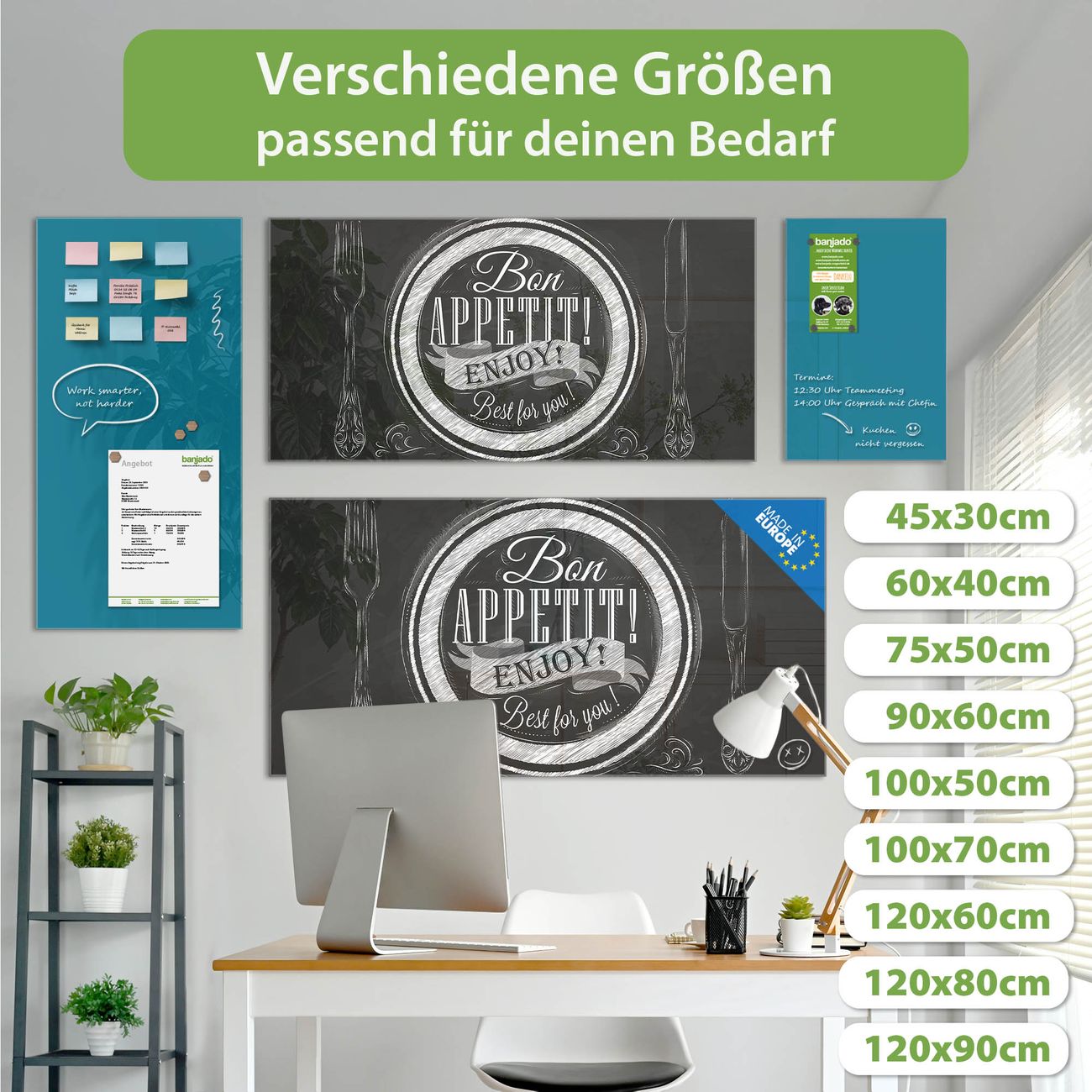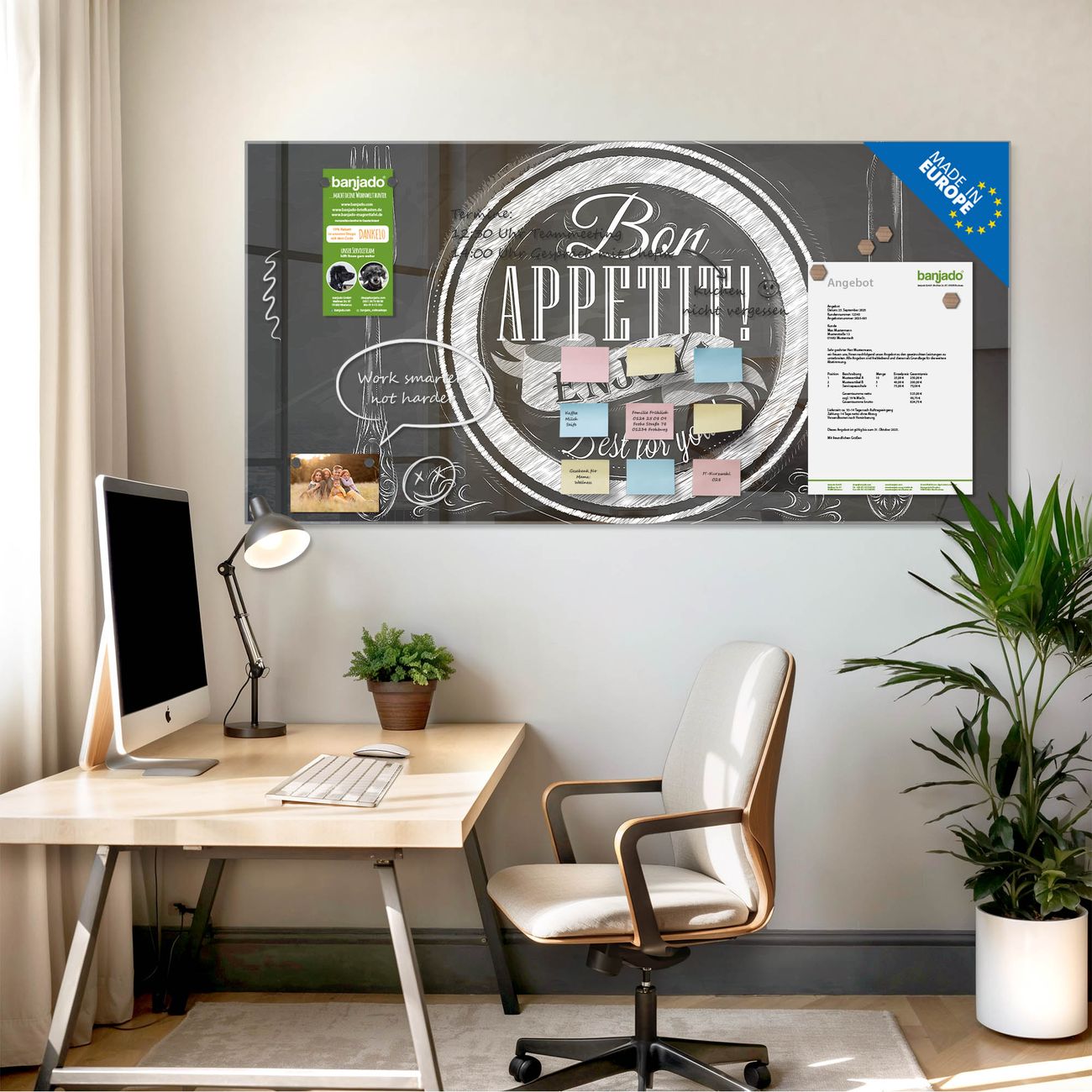 Die banjado Glas Magnettafel mit dem Motiv Motiv Bon Appetit verbindet Funktionalität mit Stil. Sie ersetzt das Zettelchaos durch klare Strukturen und bringt dabei eine warme, natürliche Atmosphäre in Ihr Zuhause. Ob im Büro, in der Küche oder im Eingangsbereich - dieses Design-Board zieht Blicke an und sorgt für Ordnung mit Charakter.