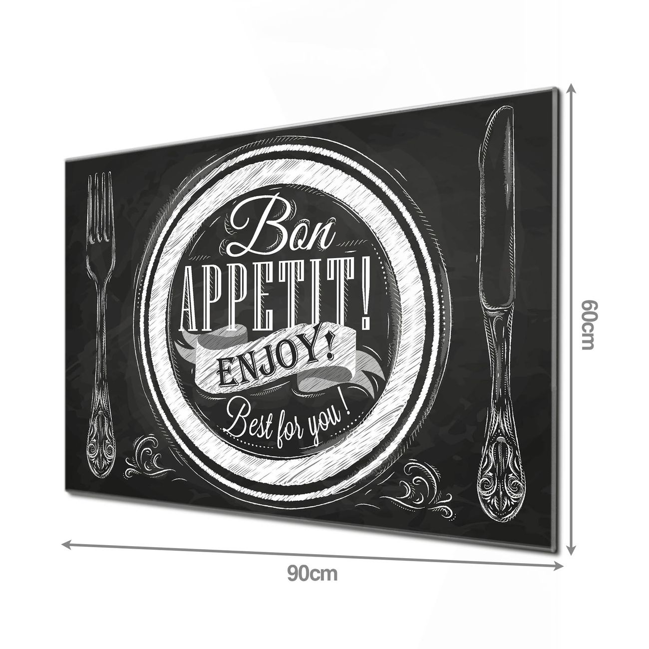Material: 4mm Sicherheitsglas mit Metallrückwand Eigenschaften: beschreibbar, magnetisch, kratzfest Maße: 90x60x0,6cm, 8,10kg schwer Motiv Nummer 12530 Bon Appetit Zubehör: inklusive 4 Neodym-Magnete