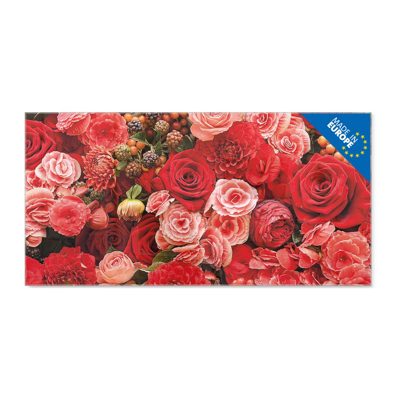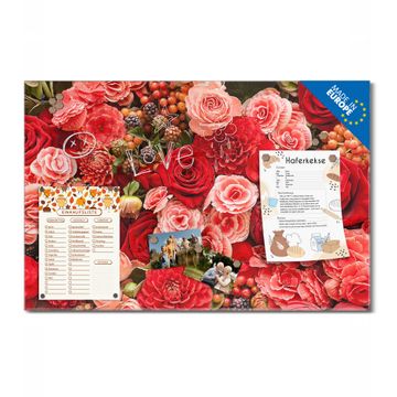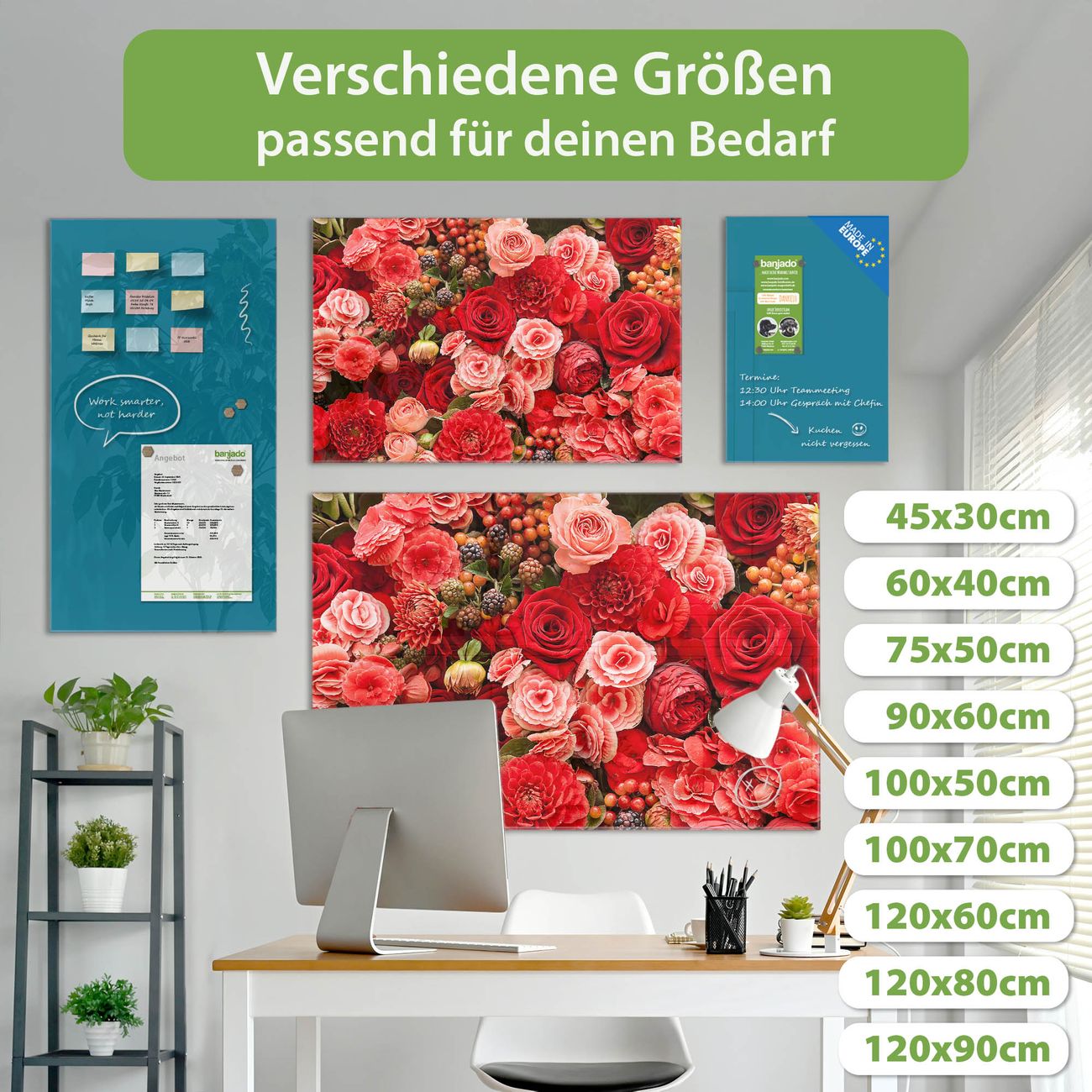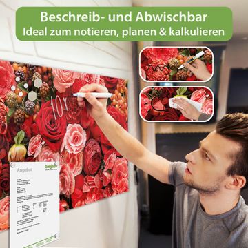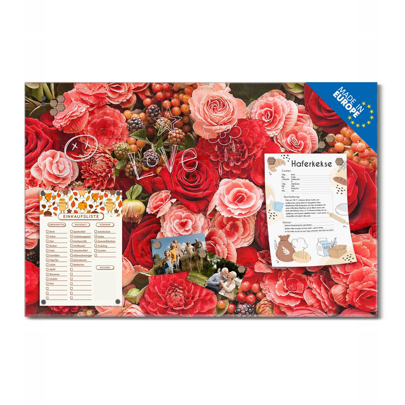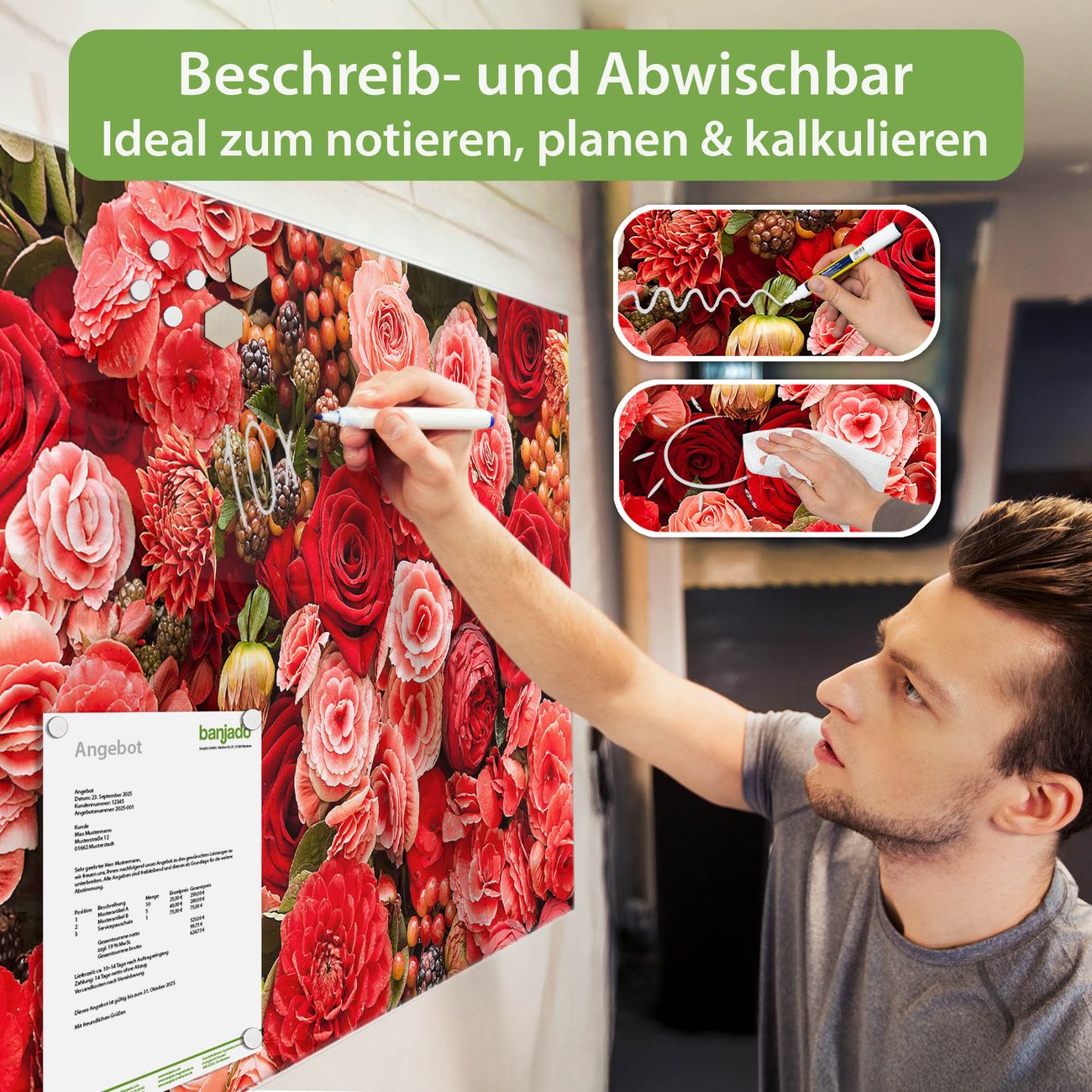 Material: 4mm Sicherheitsglas mit Metallrückwand Eigenschaften: beschreibbar, magnetisch, kratzfest Maße: 120x60x0,6cm, 10,80kg schwer Motiv Nummer 11399 Bouquet in Rot Zubehör: inklusive 4 Neodym-Magnete