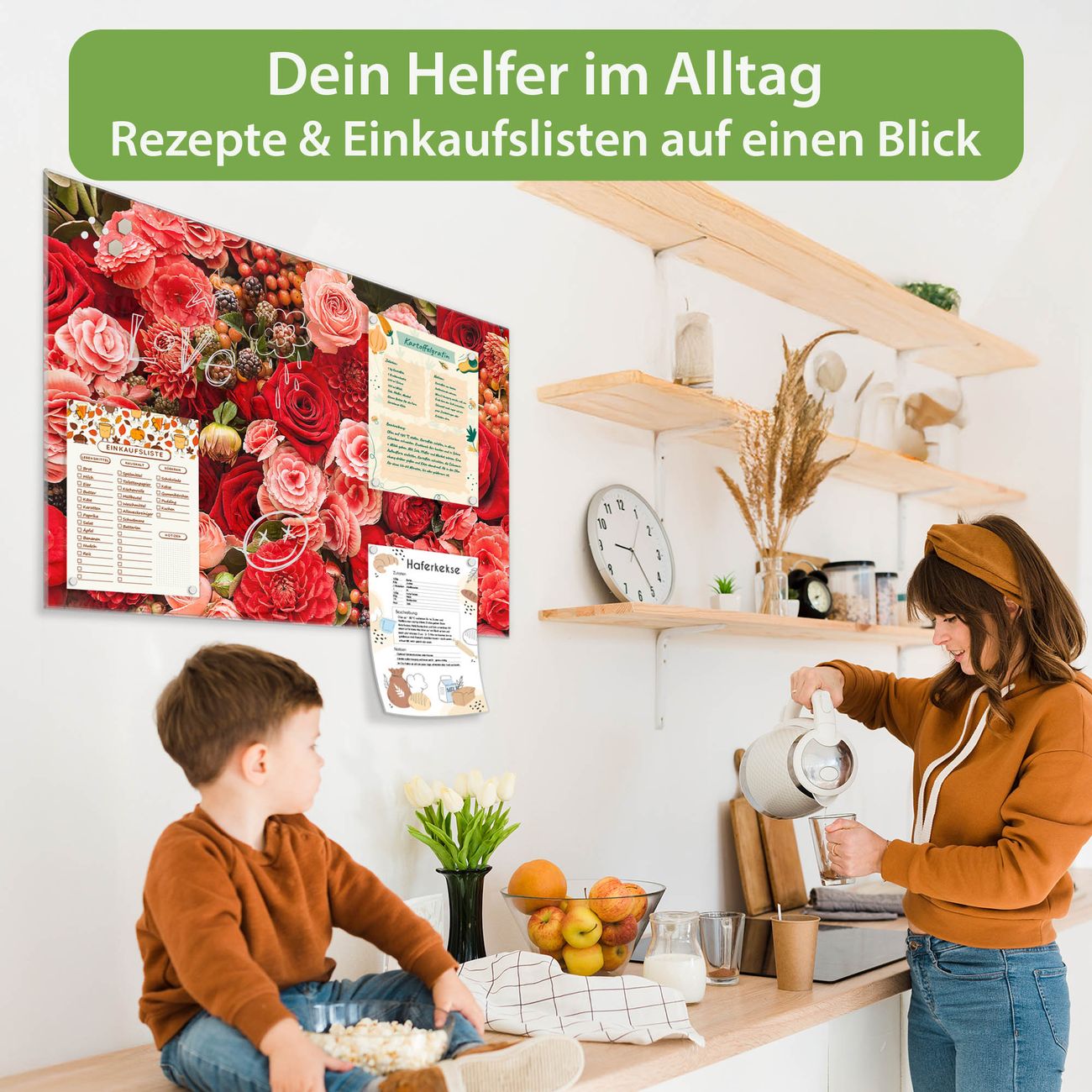 Ein Stück Design, das Ihren Alltag organisiert. Schreiben, heften, inspirieren - alles an einem Ort. Qualität, die man spürt. Montage leicht gemacht. Handwerk mit Herz - veredelt in Sachsen. Einzigartiges Design mit Motiv Motiv Bouquet in Rot Beschreibbare Glasoberfläche, leicht zu reinigen Starke Magnetkraft durch Stahlrückwand Inklusive 4 Neodym-Magneten Flexible Montageoptionen Handveredelt in Sachsen - Qualität, die bleibt