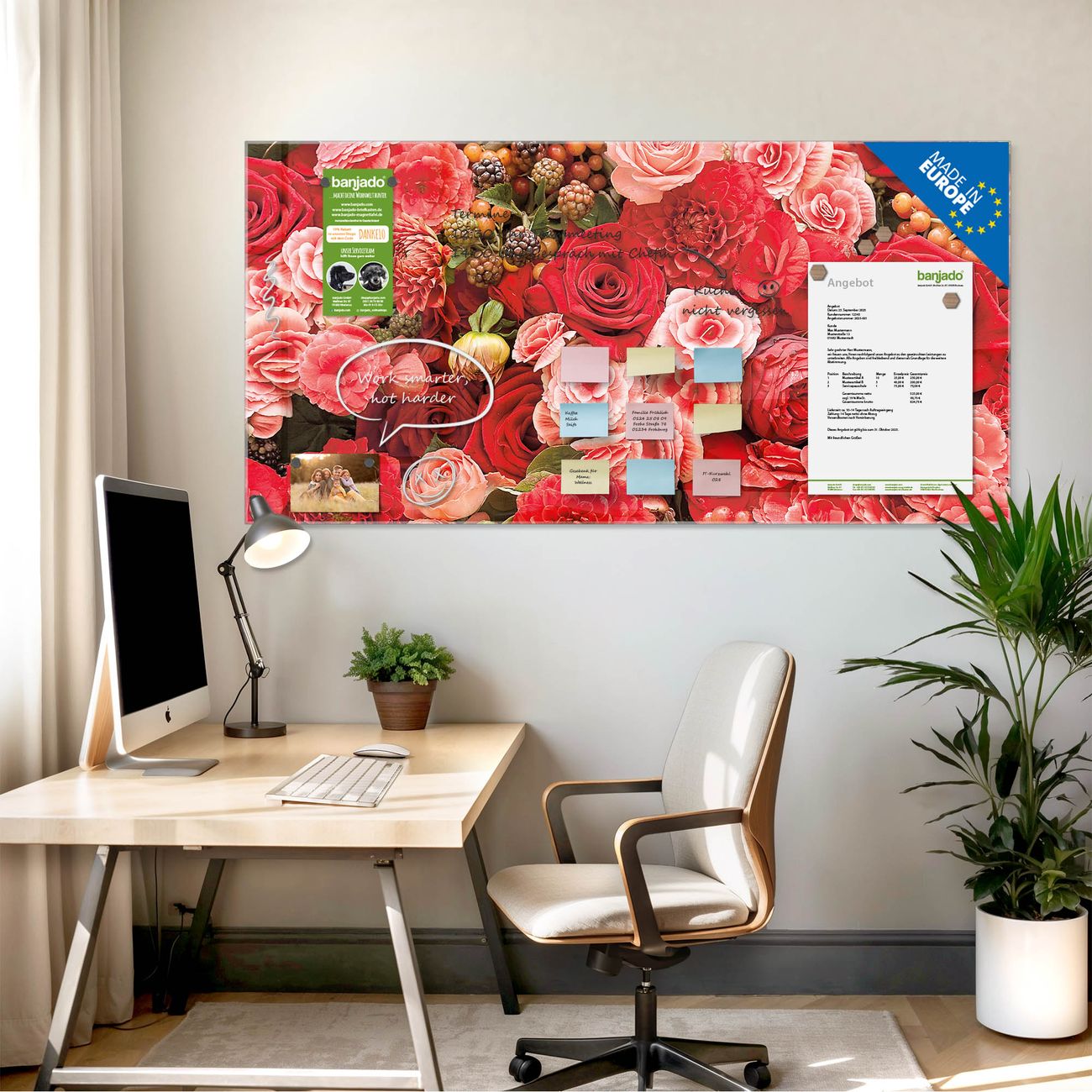 Die banjado Glas Magnettafel mit dem Motiv Motiv Bouquet in Rot verbindet Funktionalität mit Stil. Sie ersetzt das Zettelchaos durch klare Strukturen und bringt dabei eine warme, natürliche Atmosphäre in Ihr Zuhause. Ob im Büro, in der Küche oder im Eingangsbereich - dieses Design-Board zieht Blicke an und sorgt für Ordnung mit Charakter.