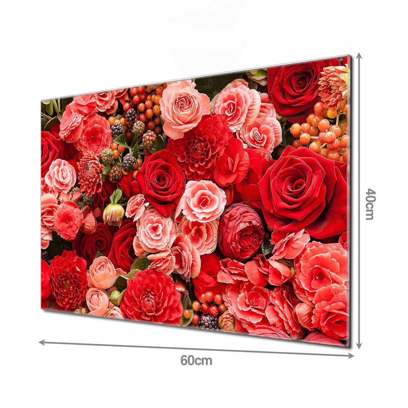 Material: 4mm Sicherheitsglas mit Metallrückwand Eigenschaften: beschreibbar, magnetisch, kratzfest Maße: 60x40x0,6cm, 3,6kg schwer Motiv Nummer 11399 Bouquet in Rot Zubehör: inklusive 4 Neodym-Magnete