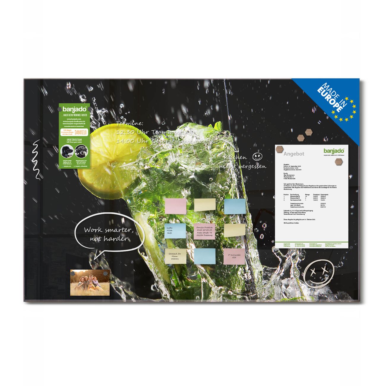Material: 4mm Sicherheitsglas mit Metallrückwand Eigenschaften: beschreibbar, magnetisch, kratzfest Maße: 120x80x0,6cm, 14,40kg schwer Motiv Nummer 10147 Brasilianischer Cocktail Zubehör: inklusive 4 Neodym-Magnete