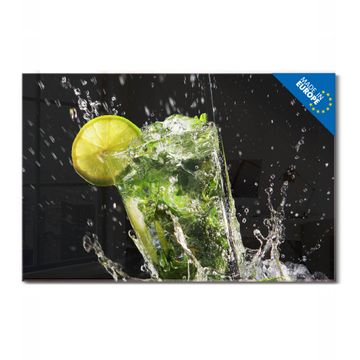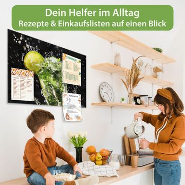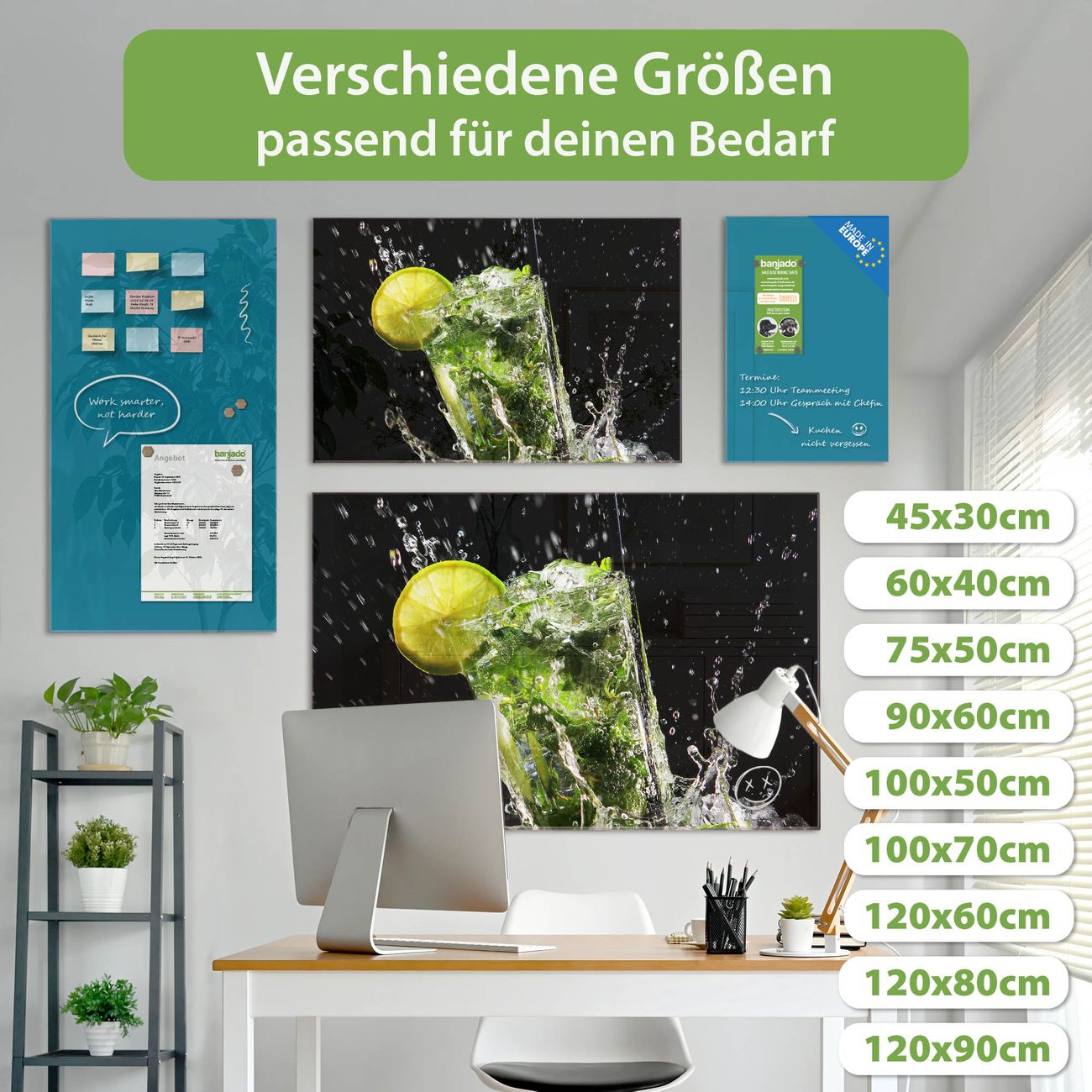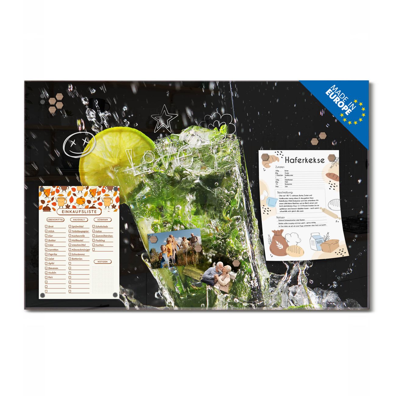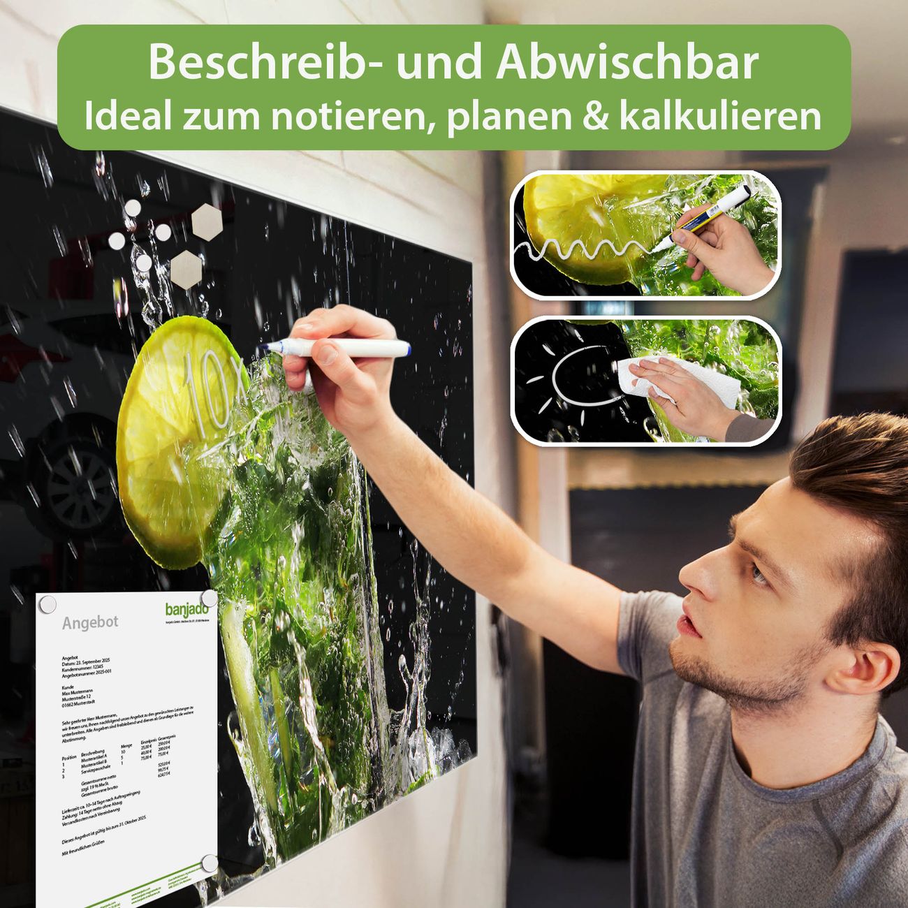 Material: 4mm Sicherheitsglas mit Metallrückwand Eigenschaften: beschreibbar, magnetisch, kratzfest Maße: 75x50x0,6cm, 5,63kg schwer Motiv Nummer 10147 Brasilianischer Cocktail Zubehör: inklusive 4 Neodym-Magnete
