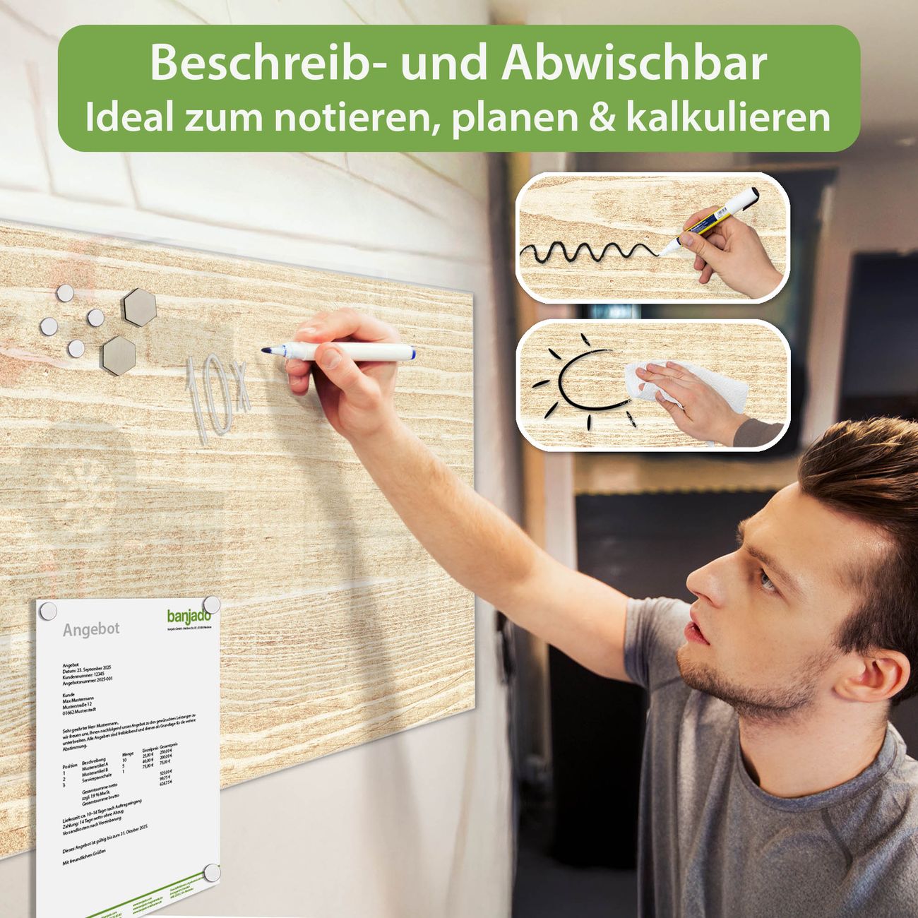 Material: 4mm Sicherheitsglas mit Metallrückwand Eigenschaften: beschreibbar, magnetisch, kratzfest Maße: 120x60x0,6cm, 10,80kg schwer Motiv Nummer 11276 Bretter Zubehör: inklusive 4 Neodym-Magnete
