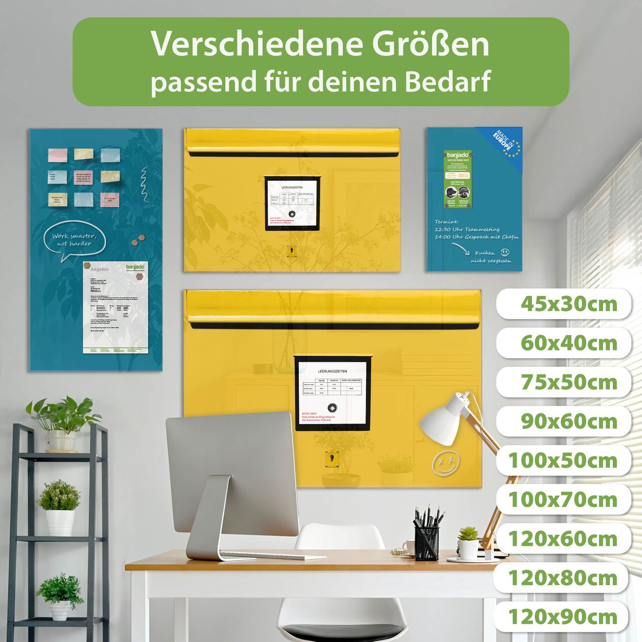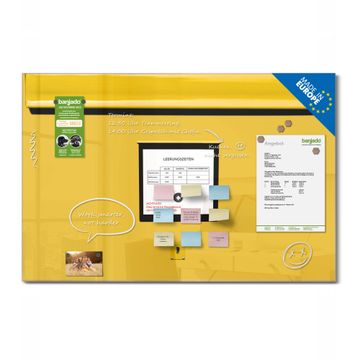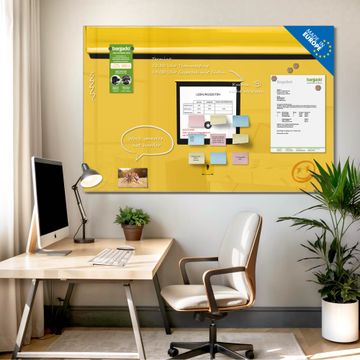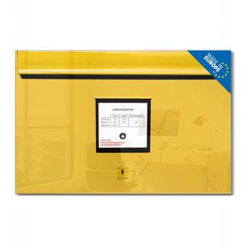 Material: 4mm Sicherheitsglas mit Metallrückwand Eigenschaften: beschreibbar, magnetisch, kratzfest Maße: 90x60x0,6cm, 8,10kg schwer Motiv Nummer 10051 Briefkasten Gelb Zubehör: inklusive 4 Neodym-Magnete