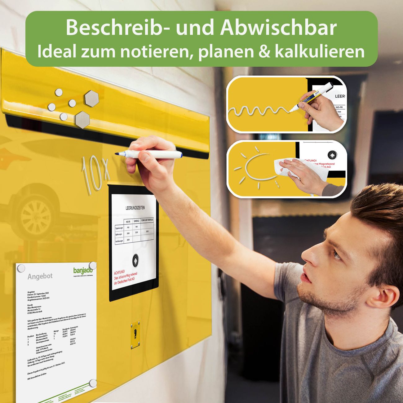 Bitte beachten Sie, dass ausschliessliche spezielle Magnete an der Glastafel haften. Wir empfehlen banjado Neodym Magnete, diese sind durch uns auf Wirksamkeit geprüft.