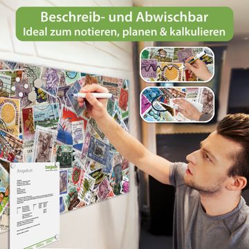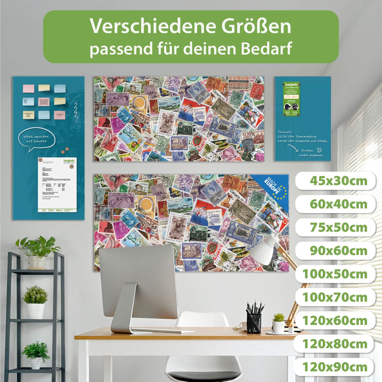 Material: 4mm Sicherheitsglas mit Metallrückwand Eigenschaften: beschreibbar, magnetisch, kratzfest Maße: 120x60x0,6cm, 10,80kg schwer Motiv Nummer 10123 Briefmarken Zubehör: inklusive 4 Neodym-Magnete