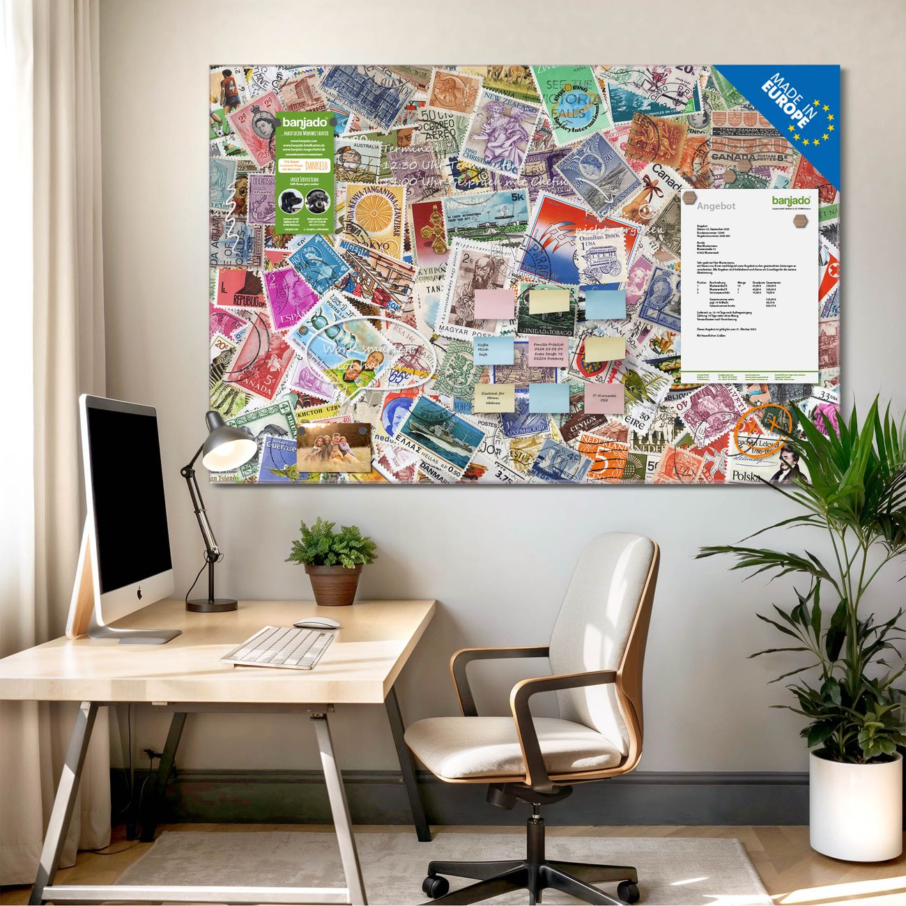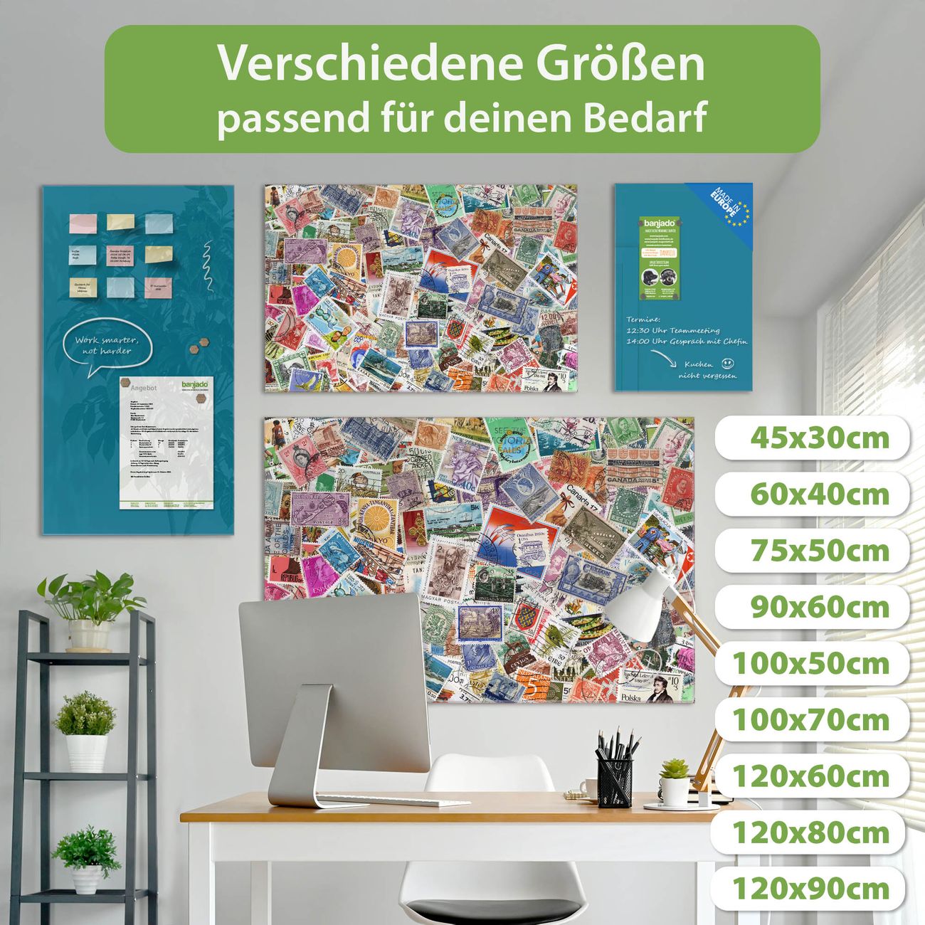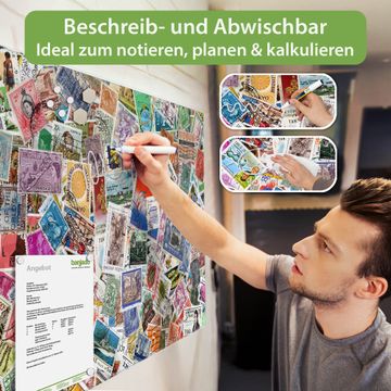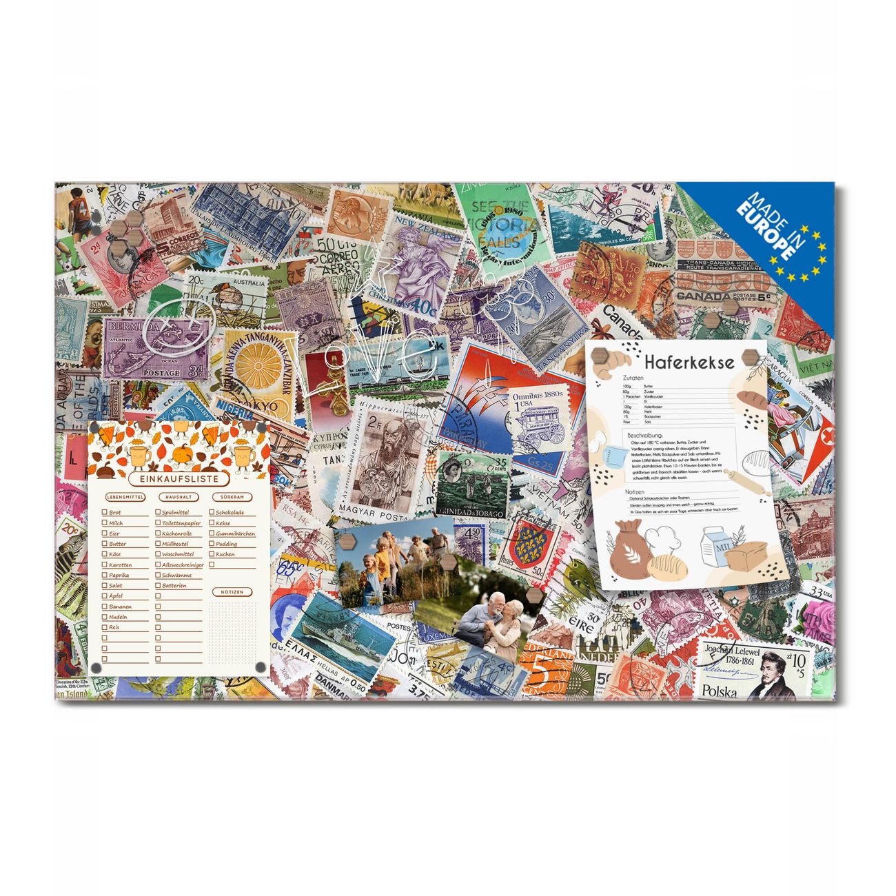 Material: 4mm Sicherheitsglas mit Metallrückwand Eigenschaften: beschreibbar, magnetisch, kratzfest Maße: 75x50x0,6cm, 5,63kg schwer Motiv Nummer 10123 Briefmarken Zubehör: inklusive 4 Neodym-Magnete