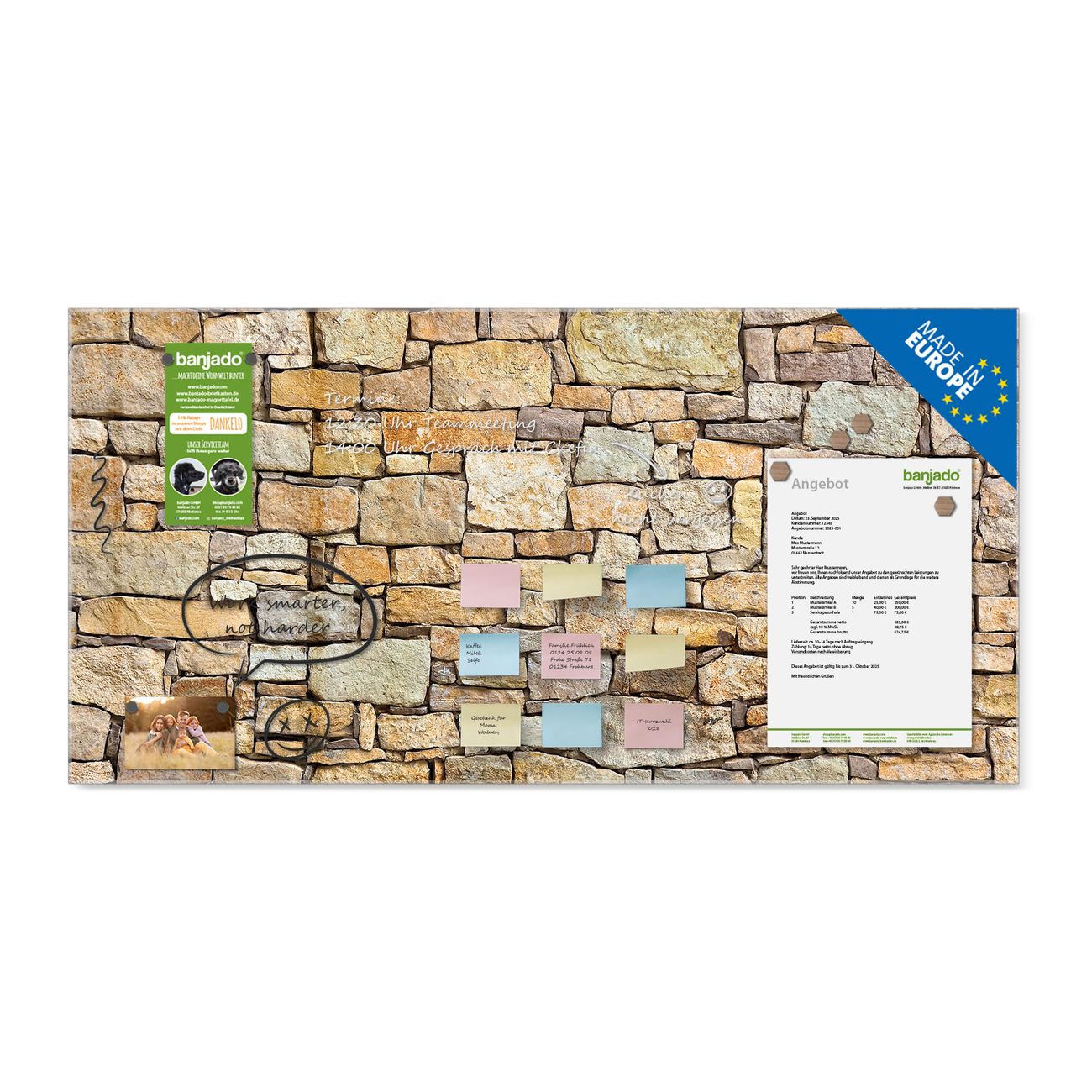 Jede Glas Magnettafel wird in unserer Werkstatt von Hand gefertigt und sorgfältig geprüft. So erhalten Sie ein echtes Qualitätsprodukt, das Funktion und Ästhetik perfekt vereint.?? Warum banjado?
