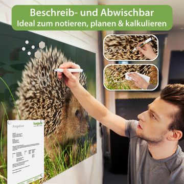 Material: 4mm Sicherheitsglas mit Metallrückwand Eigenschaften: beschreibbar, magnetisch, kratzfest Maße: 75x50x0,6cm, 5,63kg schwer Motiv Nummer 12390 Bruno Zubehör: inklusive 4 Neodym-Magnete
