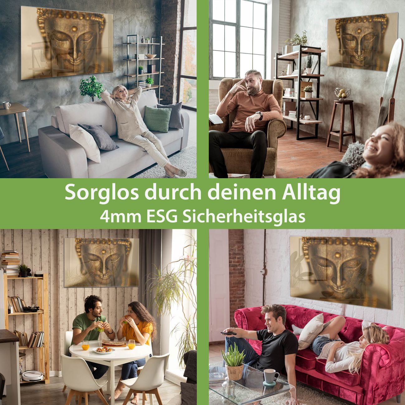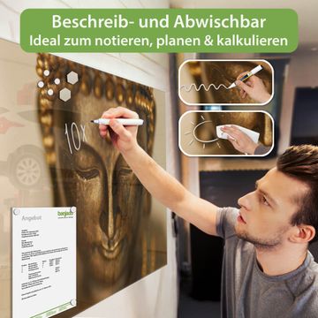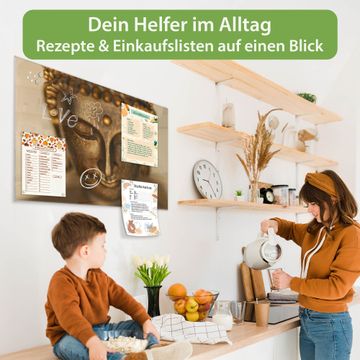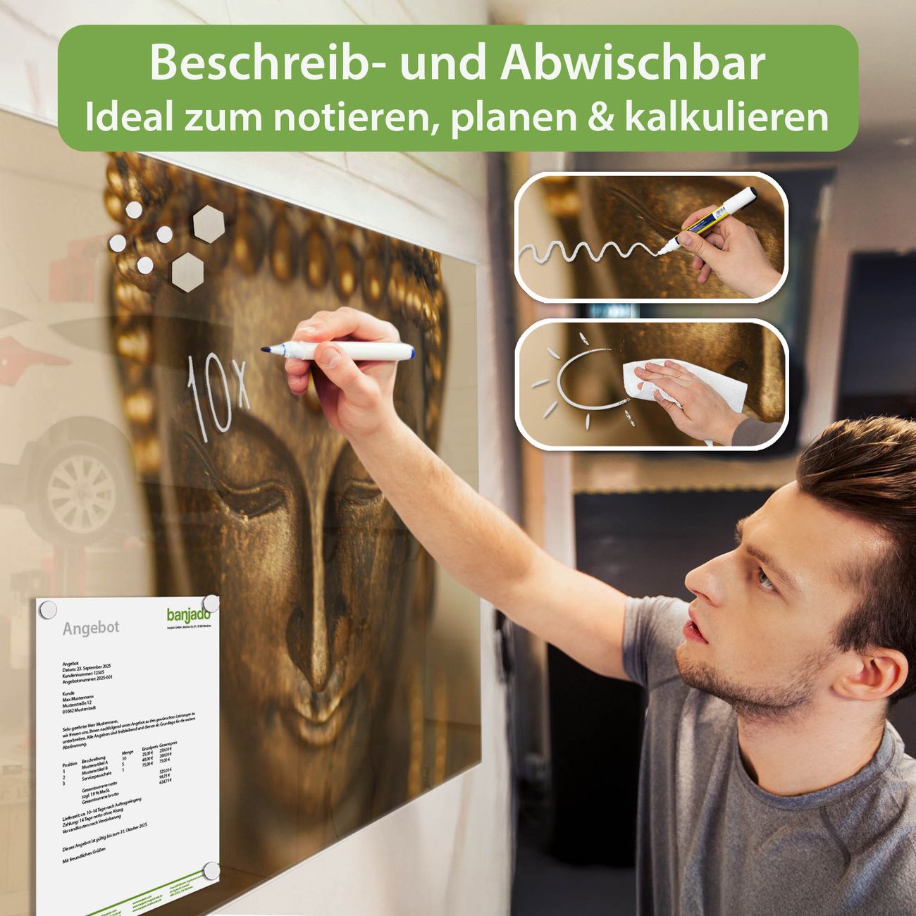 Material: 4mm Sicherheitsglas mit Metallrückwand Eigenschaften: beschreibbar, magnetisch, kratzfest Maße: 45x30x0,6cm, 2,03kg schwer Motiv Nummer 10087 Buddha Gold Zubehör: inklusive 4 Neodym-Magnete