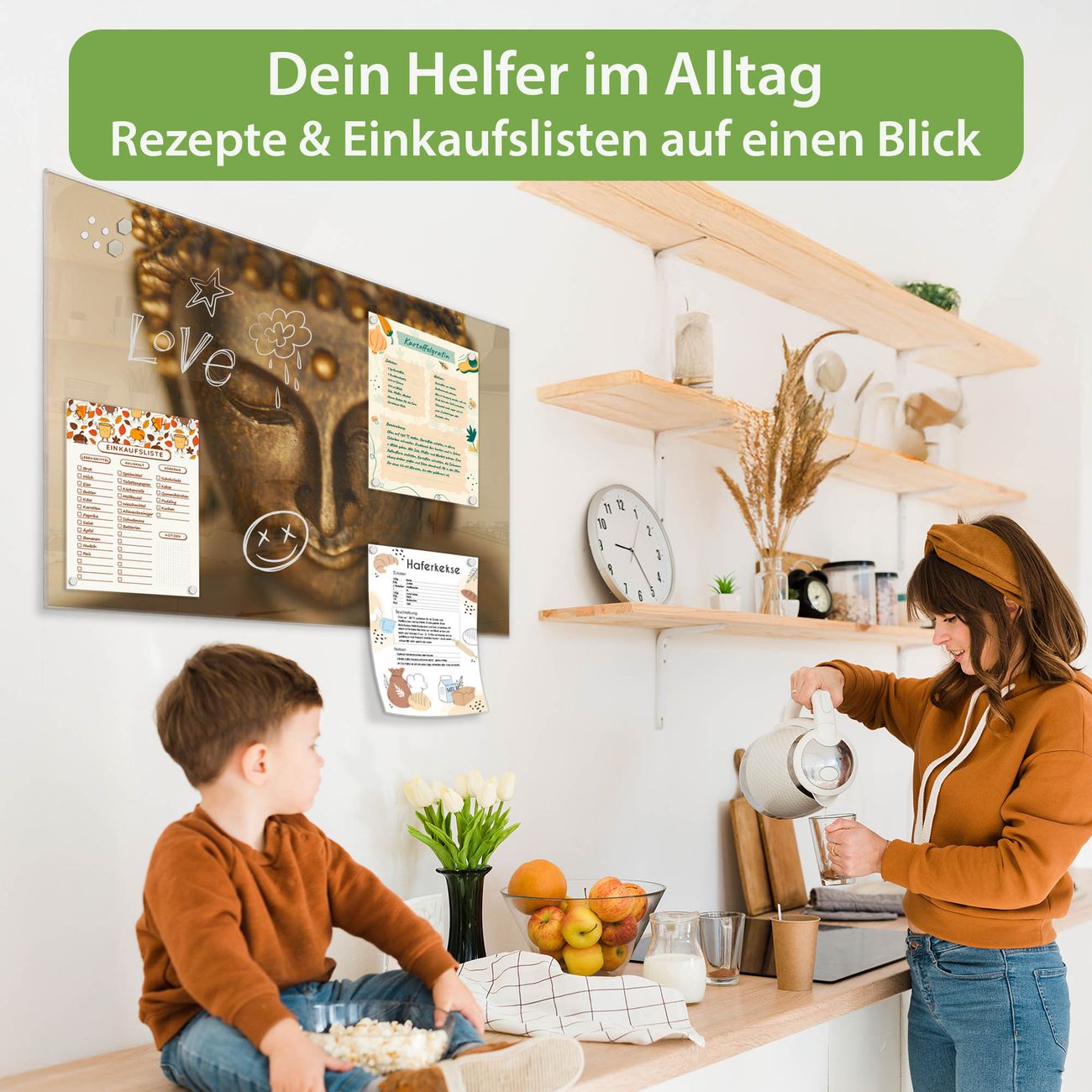 Ein Stück Design, das Ihren Alltag organisiert. Schreiben, heften, inspirieren - alles an einem Ort. Qualität, die man spürt. Montage leicht gemacht. Handwerk mit Herz - veredelt in Sachsen. Einzigartiges Design mit Motiv Motiv Buddha Gold Beschreibbare Glasoberfläche, leicht zu reinigen Starke Magnetkraft durch Stahlrückwand Inklusive 4 Neodym-Magneten Flexible Montageoptionen Handveredelt in Sachsen - Qualität, die bleibt