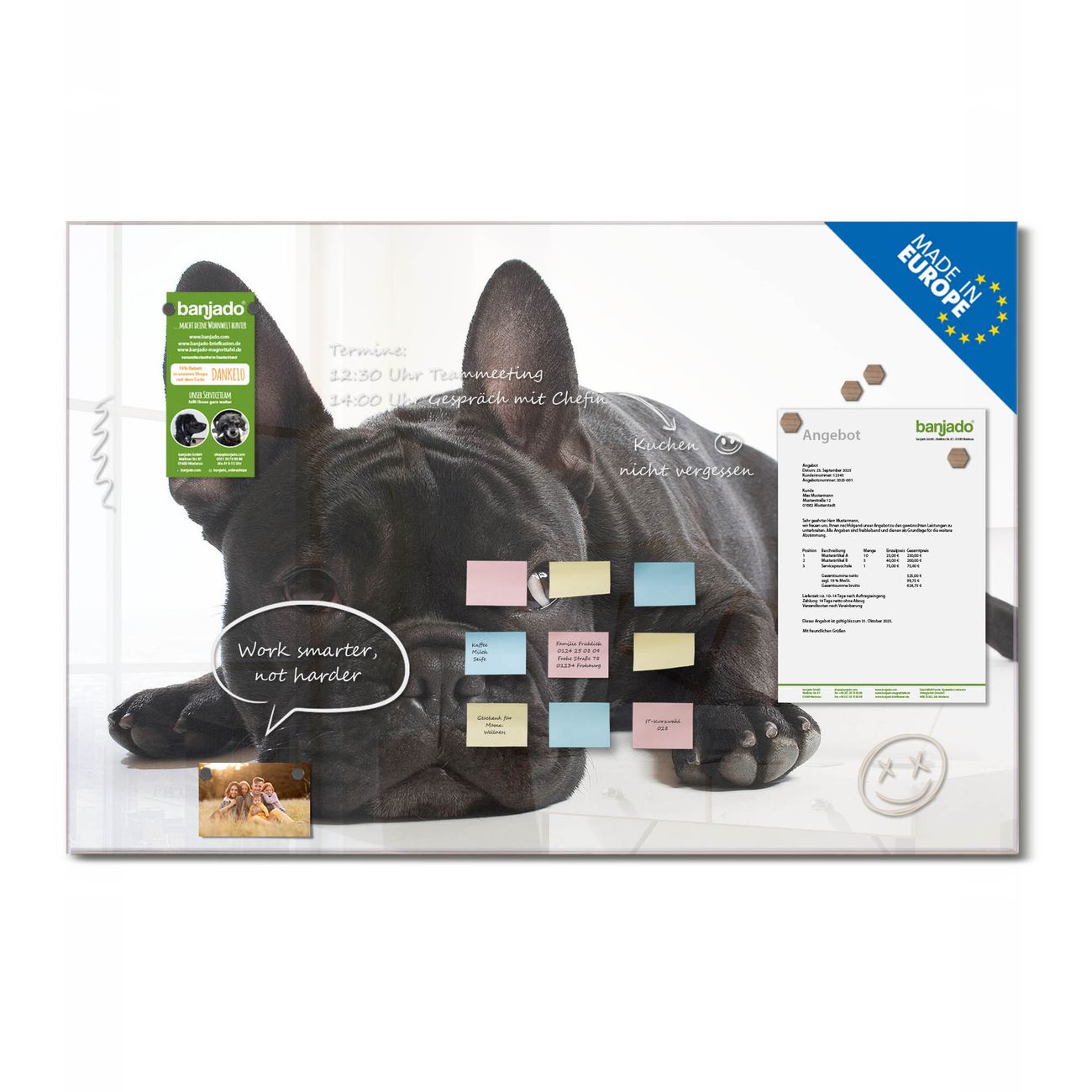Material: 4mm Sicherheitsglas mit Metallrückwand Eigenschaften: beschreibbar, magnetisch, kratzfest Maße: 120x80x0,6cm, 14,40kg schwer Motiv Nummer 10004 Bulldogge Zubehör: inklusive 4 Neodym-Magnete