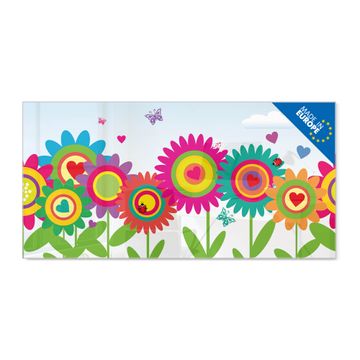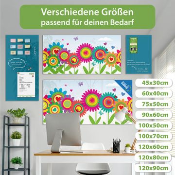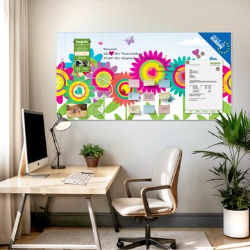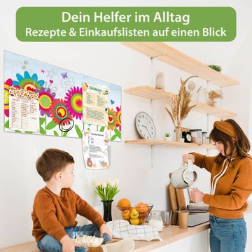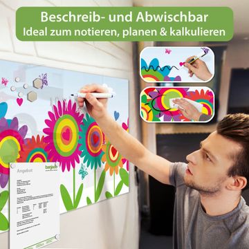 Material: 4mm Sicherheitsglas mit Metallrückwand Eigenschaften: beschreibbar, magnetisch, kratzfest Maße: 100x50x0,6cm, 7,50kg schwer Motiv Nummer 10227 Bunte Blumen Zubehör: inklusive 4 Neodym-Magnete