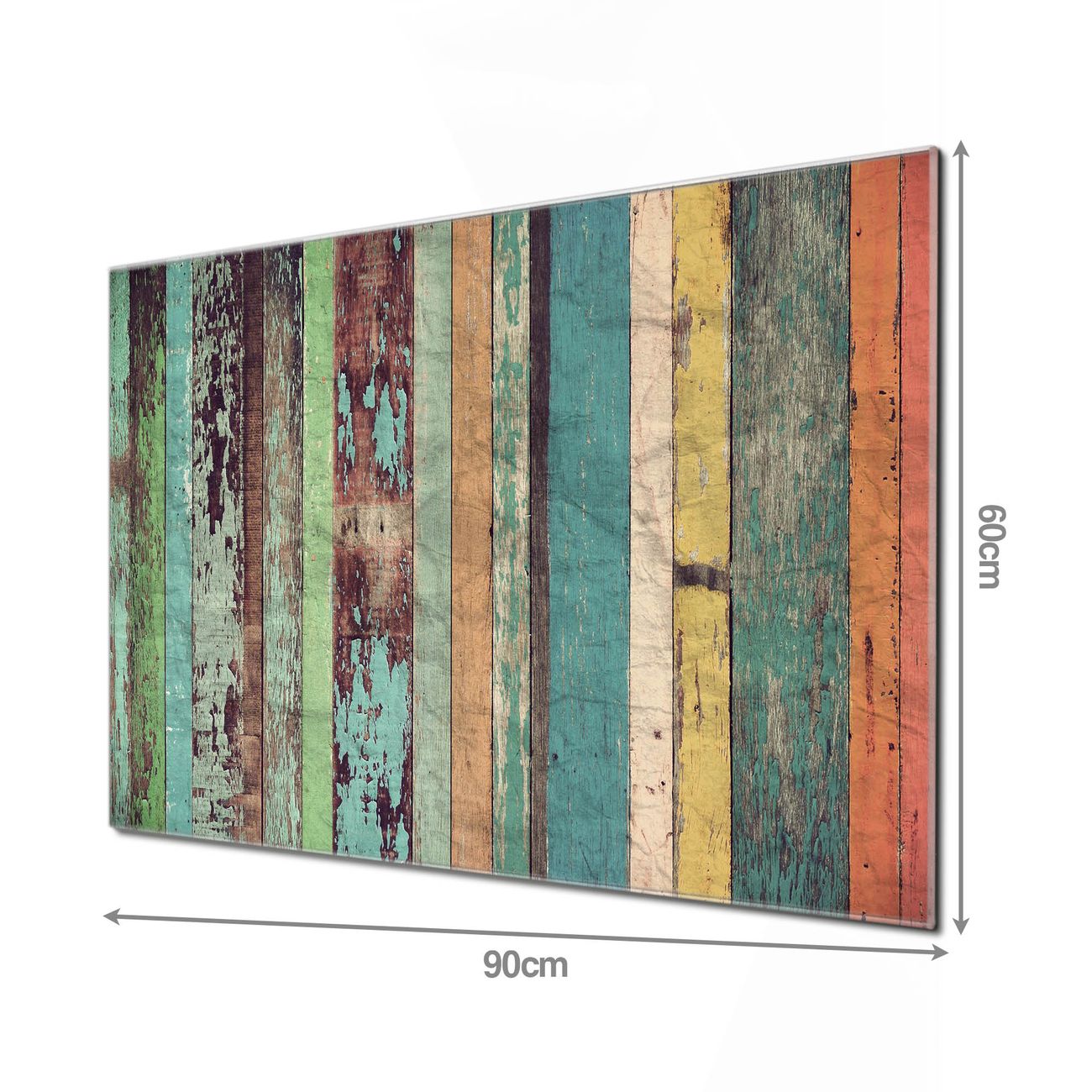 Material: 4mm Sicherheitsglas mit Metallrückwand Eigenschaften: beschreibbar, magnetisch, kratzfest Maße: 90x60x0,6cm, 8,10kg schwer Motiv Nummer 10754 Bunte Bretterwand Zubehör: inklusive 4 Neodym-Magnete