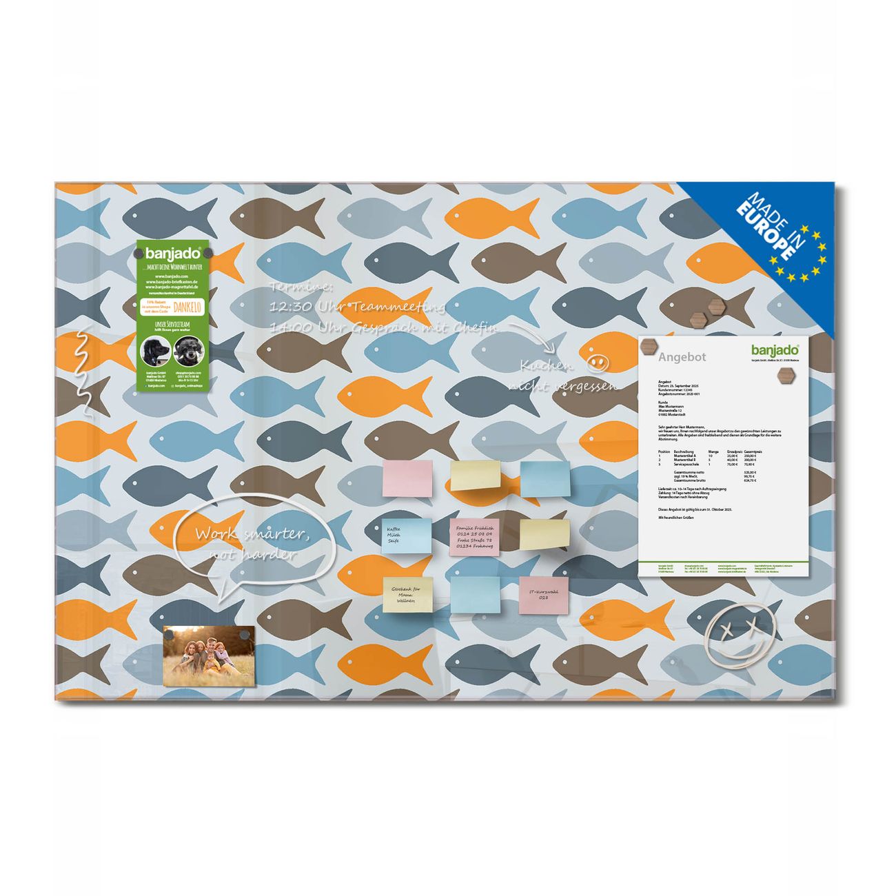 Ein Stück Design, das Ihren Alltag organisiert. Schreiben, heften, inspirieren - alles an einem Ort. Qualität, die man spürt. Montage leicht gemacht. Handwerk mit Herz - veredelt in Sachsen. Einzigartiges Design mit Motiv Motiv Bunte Fische Beschreibbare Glasoberfläche, leicht zu reinigen Starke Magnetkraft durch Stahlrückwand Inklusive 4 Neodym-Magneten Flexible Montageoptionen Handveredelt in Sachsen - Qualität, die bleibt