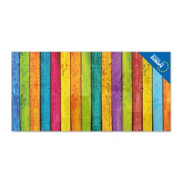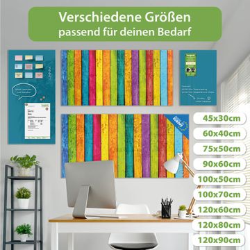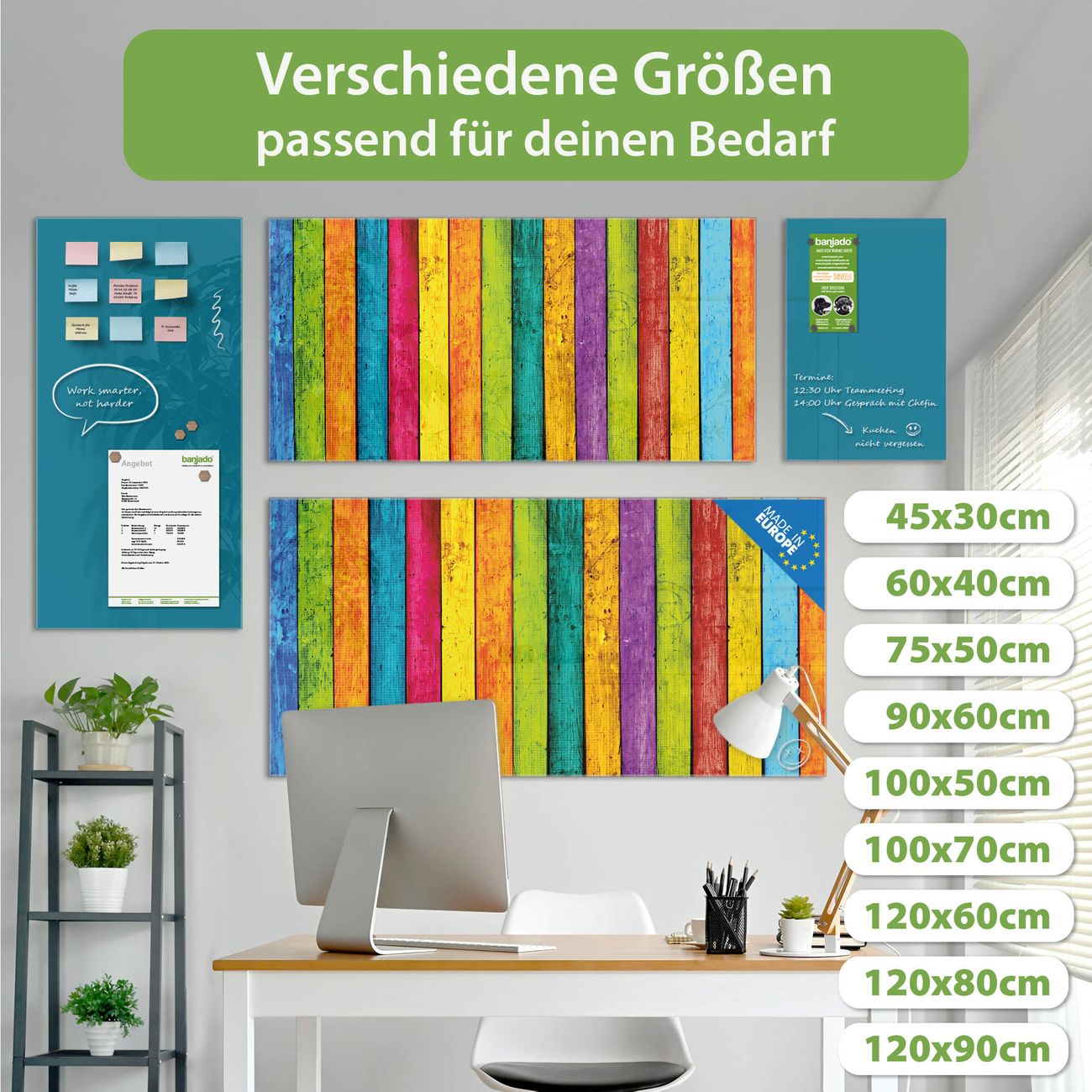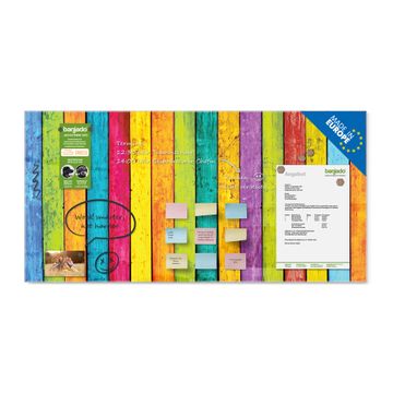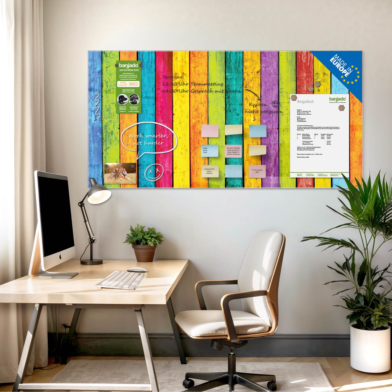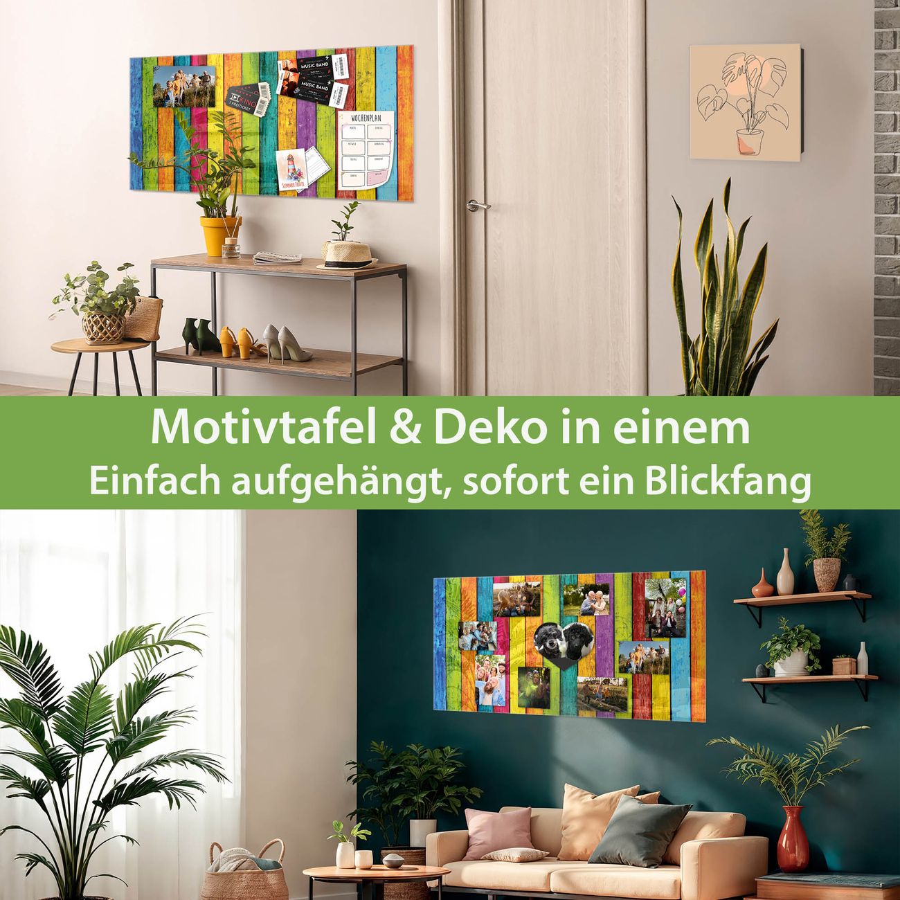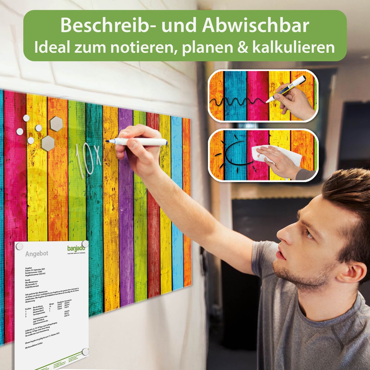 Material: 4mm Sicherheitsglas mit Metallrückwand Eigenschaften: beschreibbar, magnetisch, kratzfest Maße: 120x60x0,6cm, 10,80kg schwer Motiv Nummer 10620 Bunte Holzlatten Zubehör: inklusive 4 Neodym-Magnete