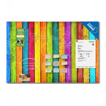 Material: 4mm Sicherheitsglas mit Metallrückwand Eigenschaften: beschreibbar, magnetisch, kratzfest Maße: 120x80x0,6cm, 14,40kg schwer Motiv Nummer 10620 Bunte Holzlatten Zubehör: inklusive 4 Neodym-Magnete
