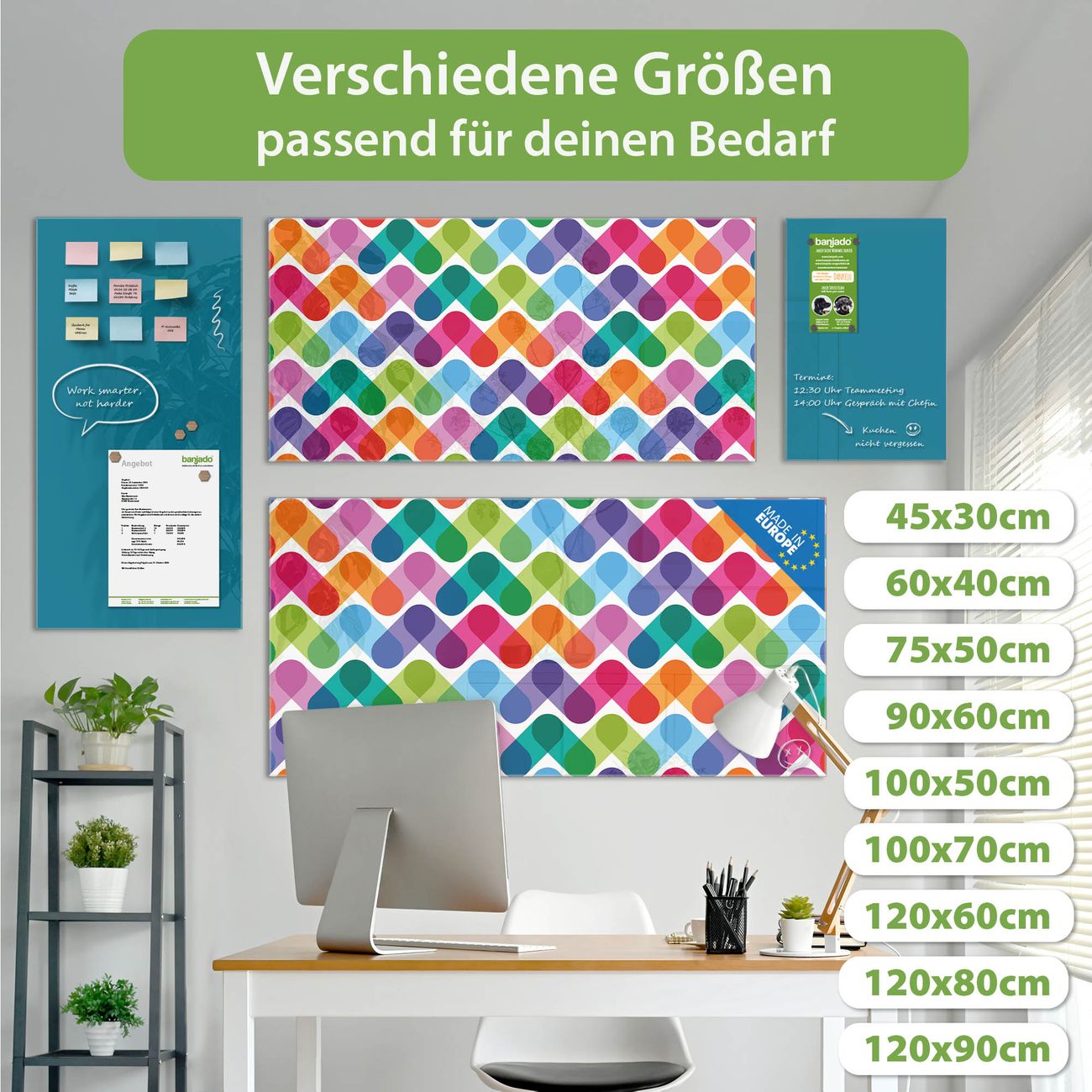 Material: 4mm Sicherheitsglas mit Metallrückwand Eigenschaften: beschreibbar, magnetisch, kratzfest Maße: 100x50x0,6cm, 7,50kg schwer Motiv Nummer 12184 Bunte Ketten Zubehör: inklusive 4 Neodym-Magnete