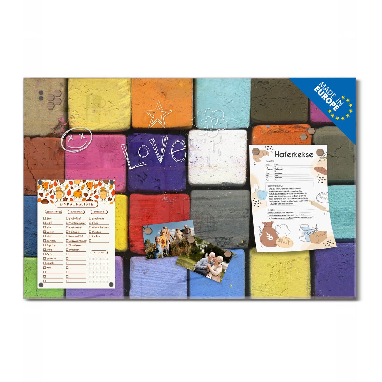 Material: 4mm Sicherheitsglas mit Metallrückwand Eigenschaften: beschreibbar, magnetisch, kratzfest Maße: 60x40x0,6cm, 3,6kg schwer Motiv Nummer 10185 Bunte Kreide Zubehör: inklusive 4 Neodym-Magnete