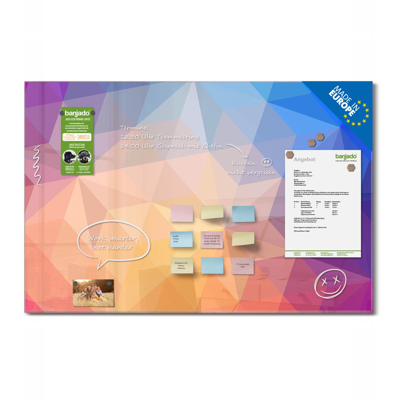 Material: 4mm Sicherheitsglas mit Metallrückwand Eigenschaften: beschreibbar, magnetisch, kratzfest Maße: 120x80x0,6cm, 14,40kg schwer Motiv Nummer 10669 Bunte Kristalle Zubehör: inklusive 4 Neodym-Magnete