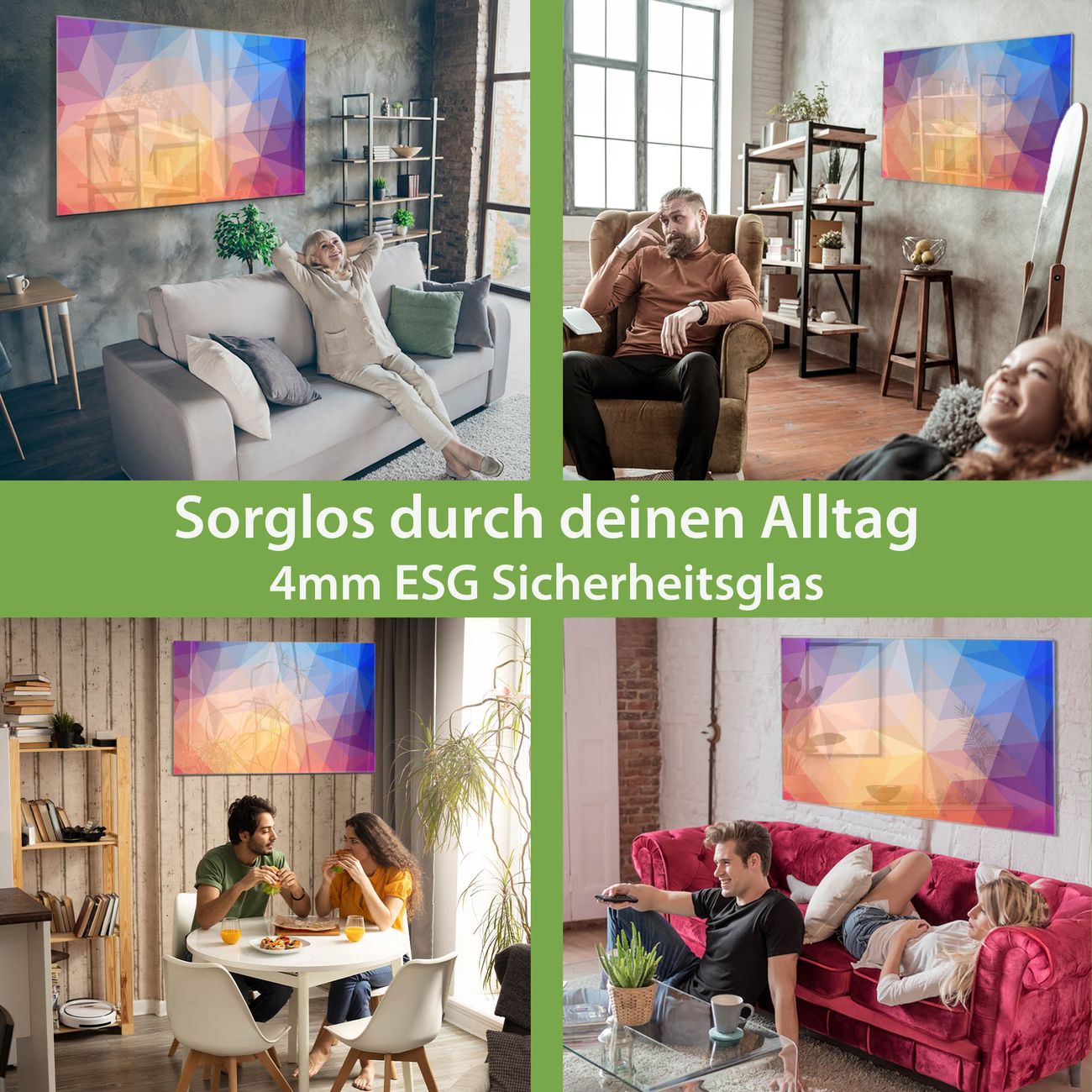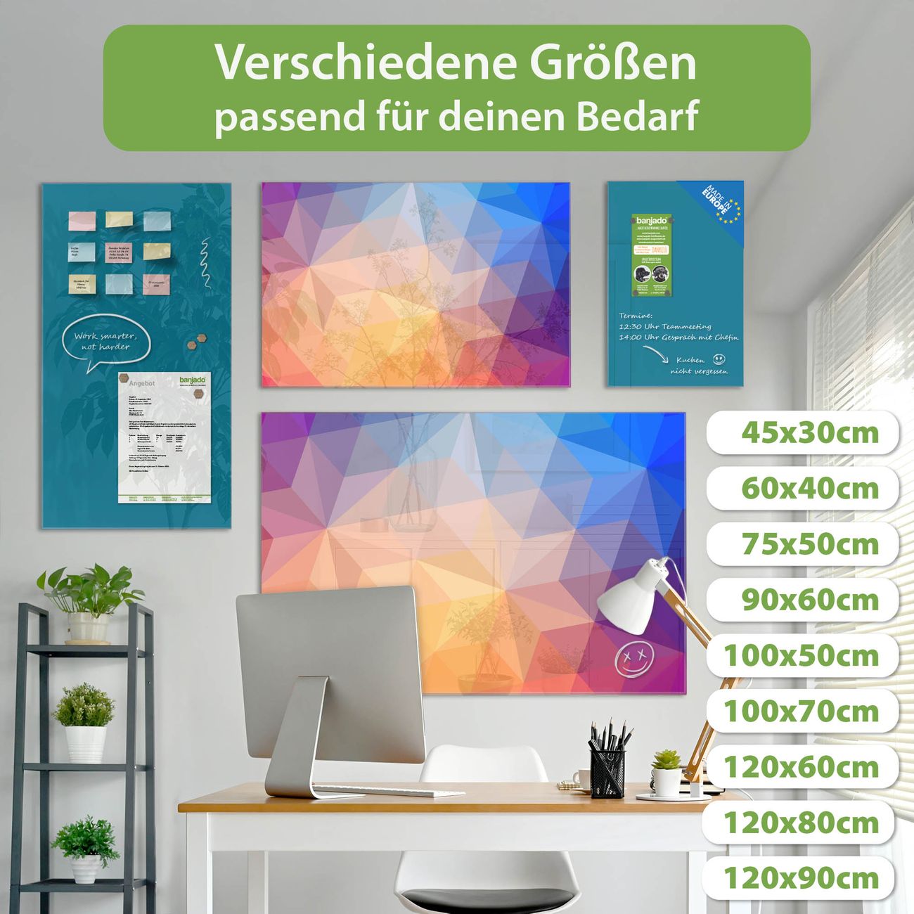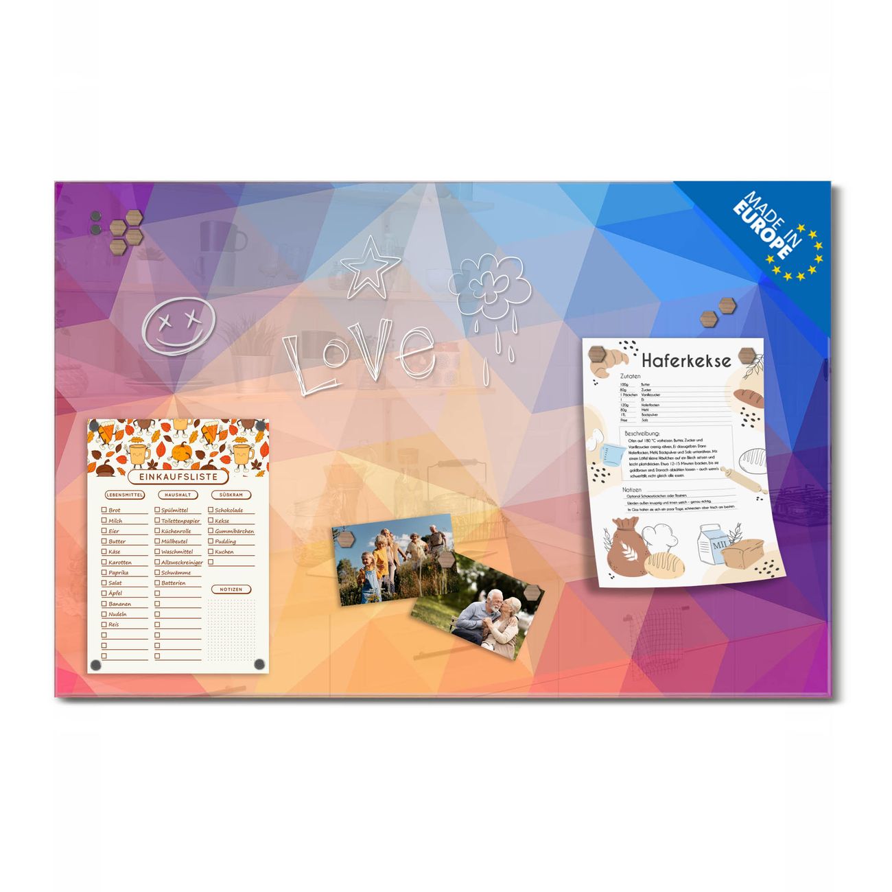 Material: 4mm Sicherheitsglas mit Metallrückwand Eigenschaften: beschreibbar, magnetisch, kratzfest Maße: 45x30x0,6cm, 2,03kg schwer Motiv Nummer 10669 Bunte Kristalle Zubehör: inklusive 4 Neodym-Magnete