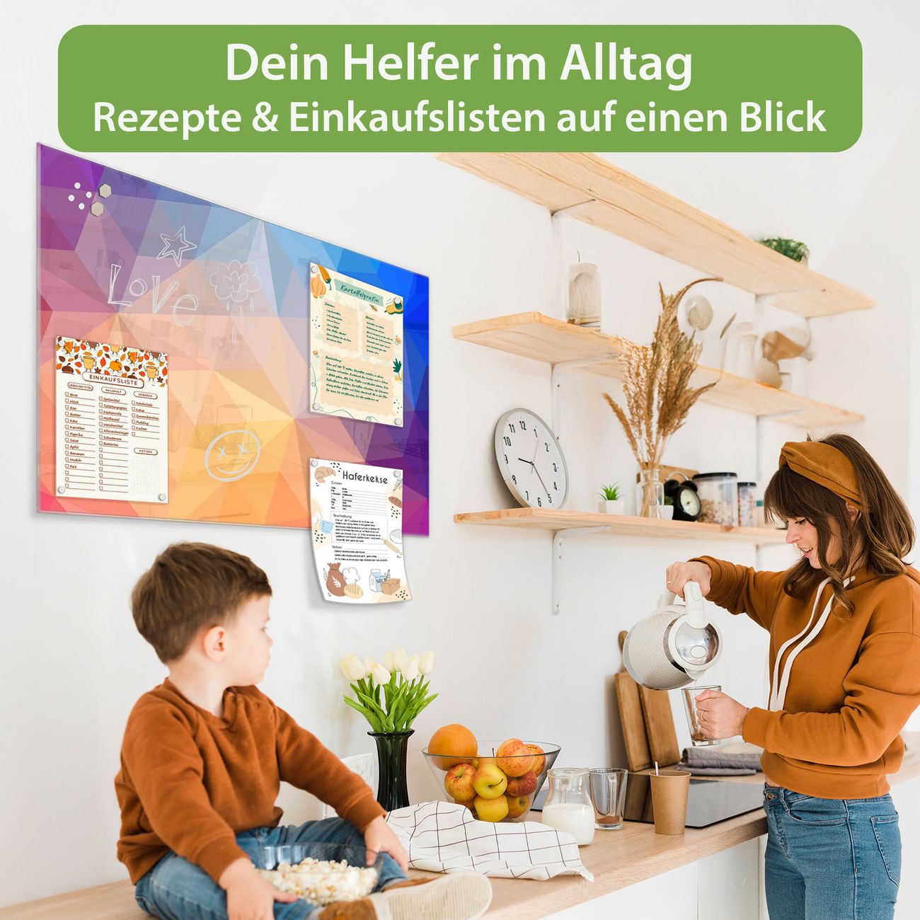 Auf der glatten Glasoberfläche lassen sich Termine, Rezepte oder Notizen ganz einfach mit Kreidestiften festhalten und rückstandslos entfernen. Starke Neodym-Magnete halten Ihre wichtigsten Erinnerungen sicher an Ort und Stelle. So entsteht Ihre ganz persönliche Ideenwand - jeden Tag neu.