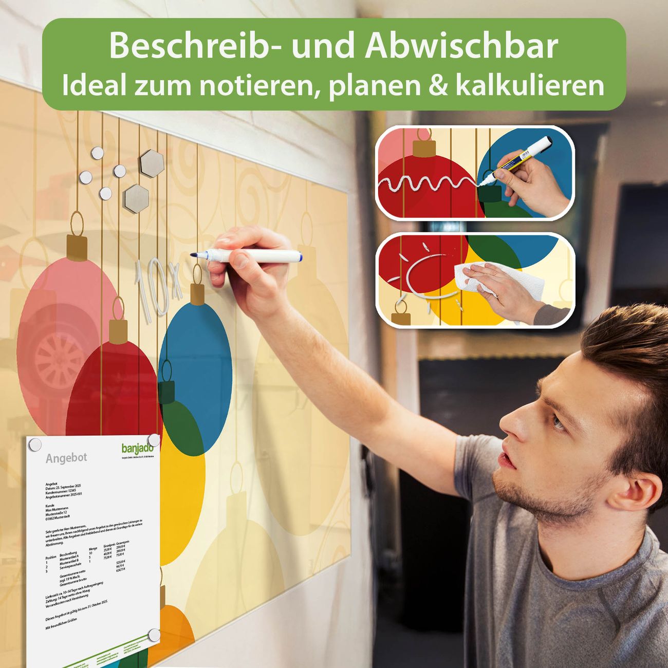 Material: 4mm Sicherheitsglas mit Metallrückwand Eigenschaften: beschreibbar, magnetisch, kratzfest Maße: 75x50x0,6cm, 5,63kg schwer Motiv Nummer 10840 Bunte Kugeln Zubehör: inklusive 4 Neodym-Magnete