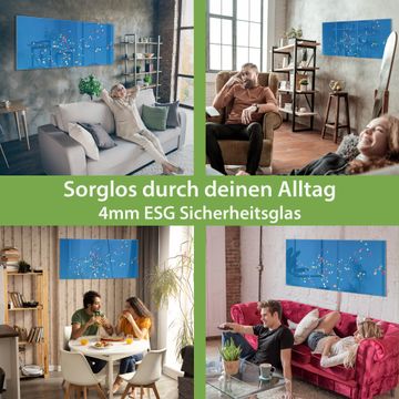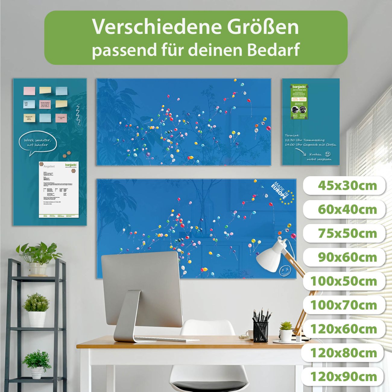 Material: 4mm Sicherheitsglas mit Metallrückwand Eigenschaften: beschreibbar, magnetisch, kratzfest Maße: 100x50x0,6cm, 7,50kg schwer Motiv Nummer 12505 Bunte Luftballons Zubehör: inklusive 4 Neodym-Magnete