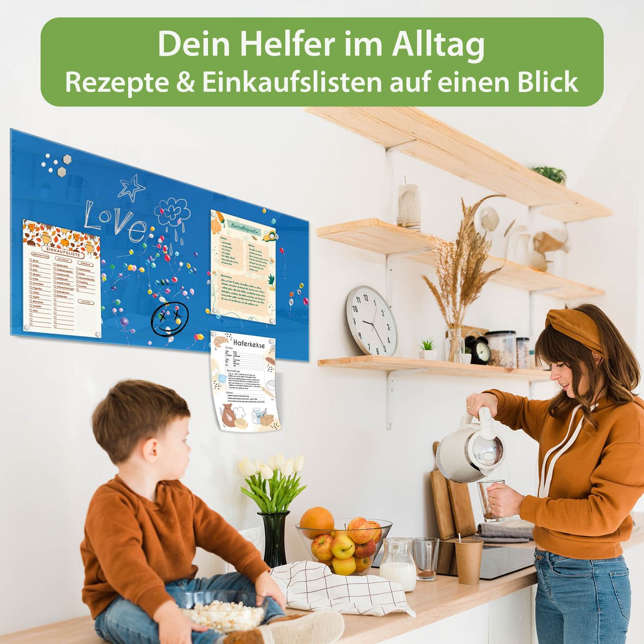 Auf der glatten Glasoberfläche lassen sich Termine, Rezepte oder Notizen ganz einfach mit Kreidestiften festhalten und rückstandslos entfernen. Starke Neodym-Magnete halten Ihre wichtigsten Erinnerungen sicher an Ort und Stelle. So entsteht Ihre ganz persönliche Ideenwand - jeden Tag neu.